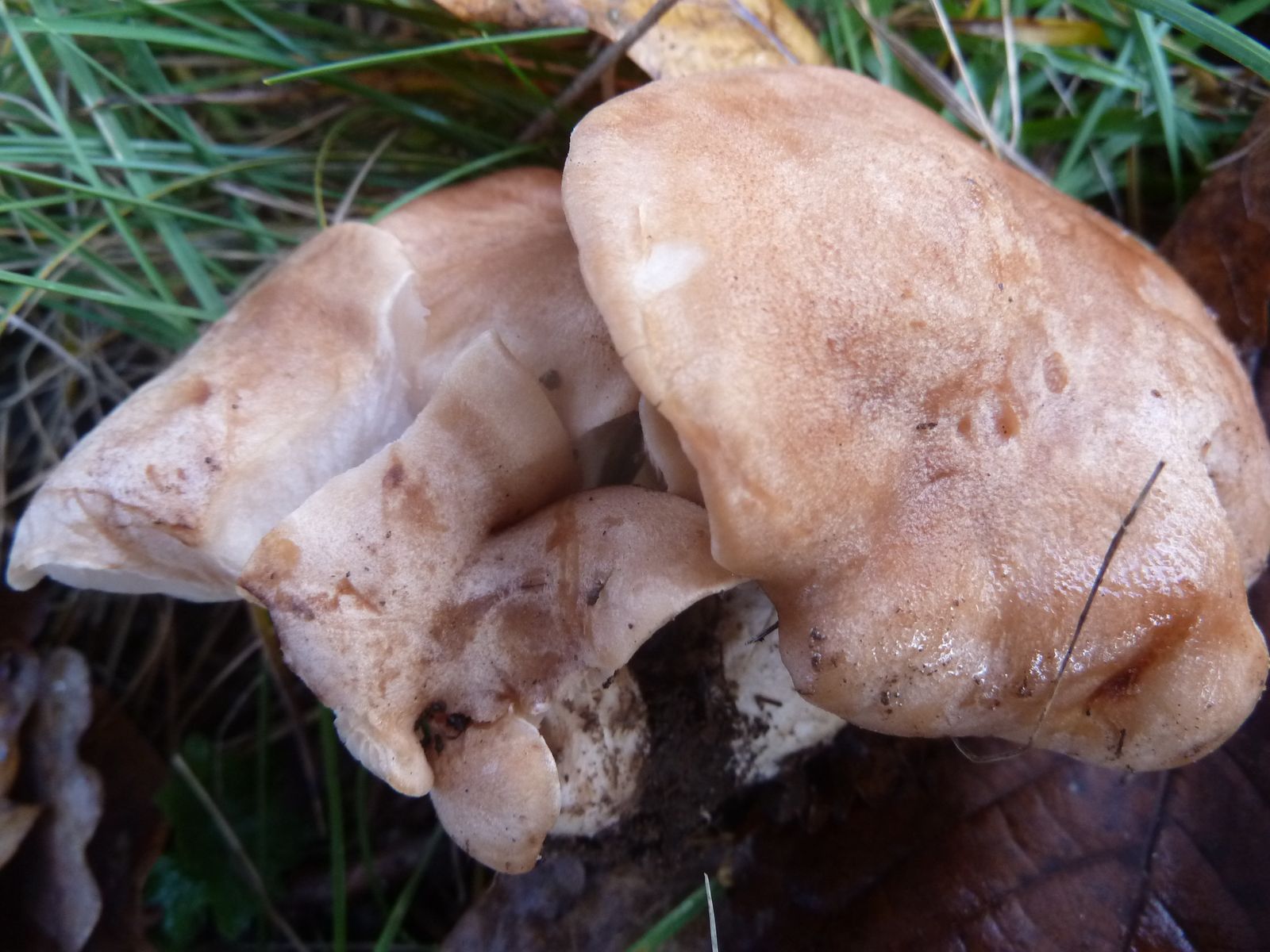 Diese etwas büschelig wachsenden Exemplare habe ich heute unter einer sehr alten Eiche gefunden. Ansonsten war da noch Wildkirsche und einiges Gestrüpp in der Nähe. Wegen dem Burggraben würde ich eine Tricholoma vermuten. Wenn ich nicht schon die falsche Gattung erwischt habe und mich bei Tricholoma umsehe, könnte das vielleicht ein Brandiger Ritterling sein? Der soll hauptsächlich bei Buchen wachsen und nur selten bei Eichen zu finden sein.