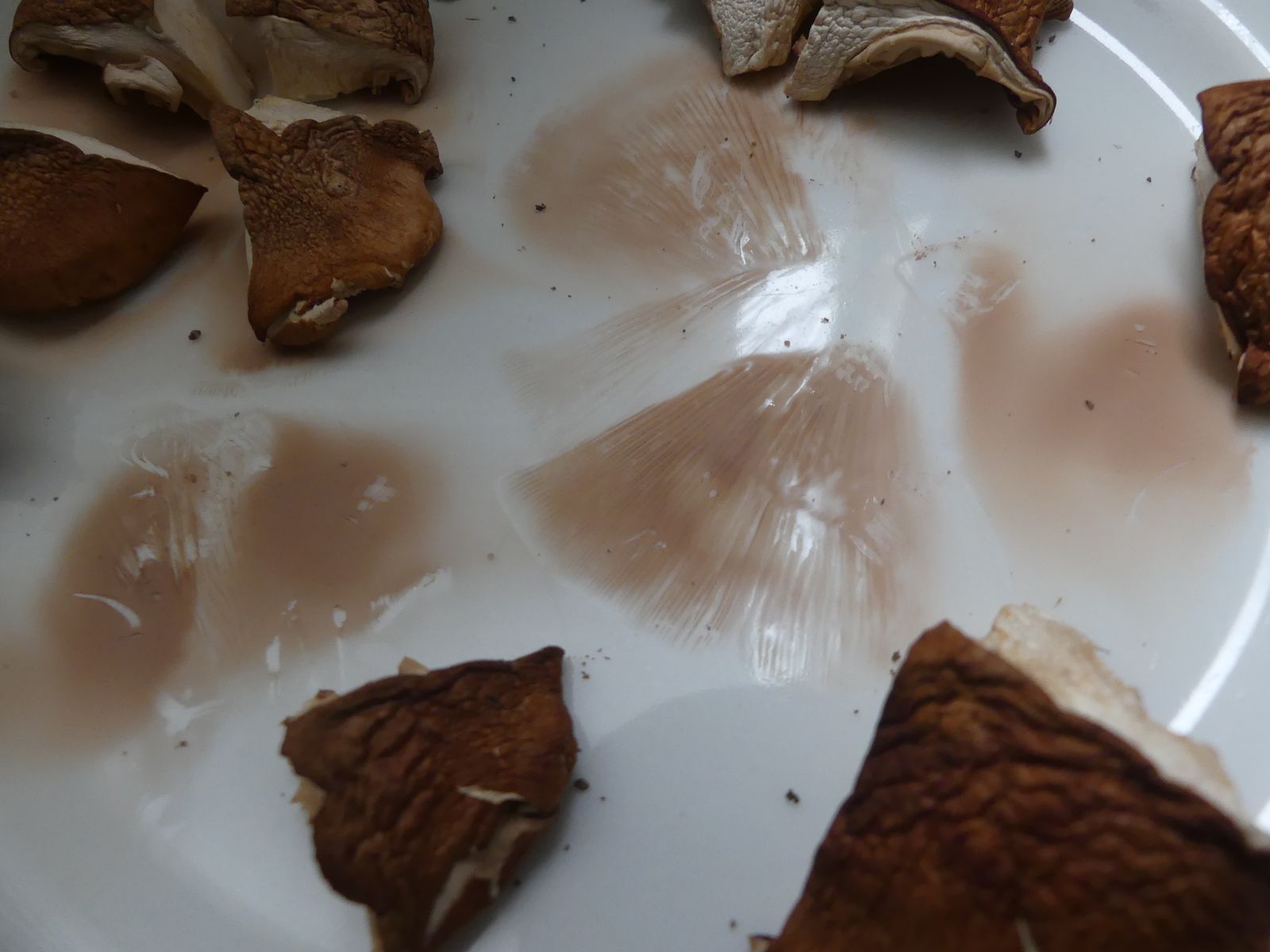 • Sooo, mit reichlich Verspätung kann ich doch noch zur Bestätigung den Sporenabwurf nachreichen. Am Montagabend war nix zu sehen, auch Dienstagmorgen nichts. Dann habe ich die Tellerlinge auf den Teller gelegt und auf die Zentralheizung im Keller gestellt.