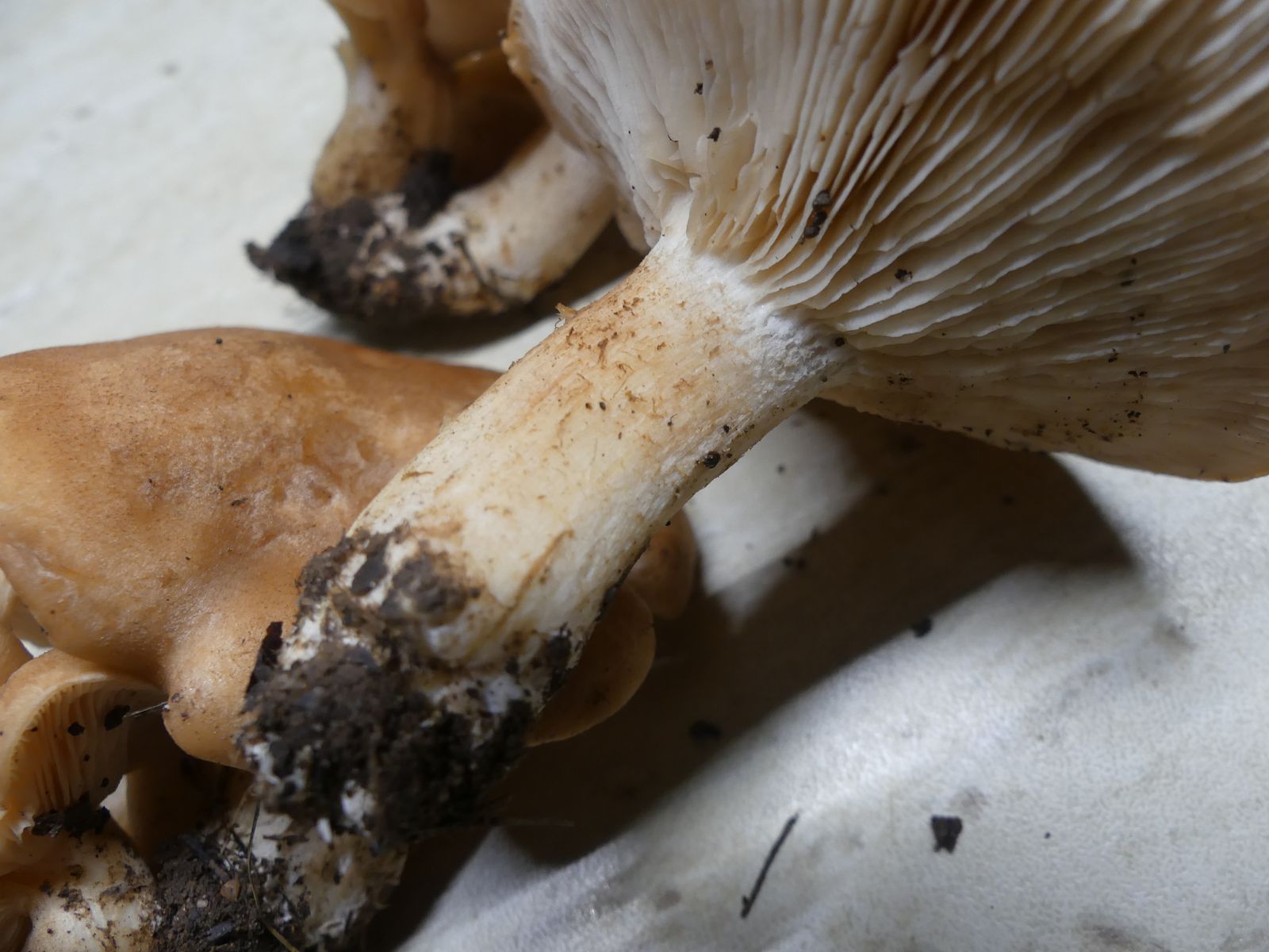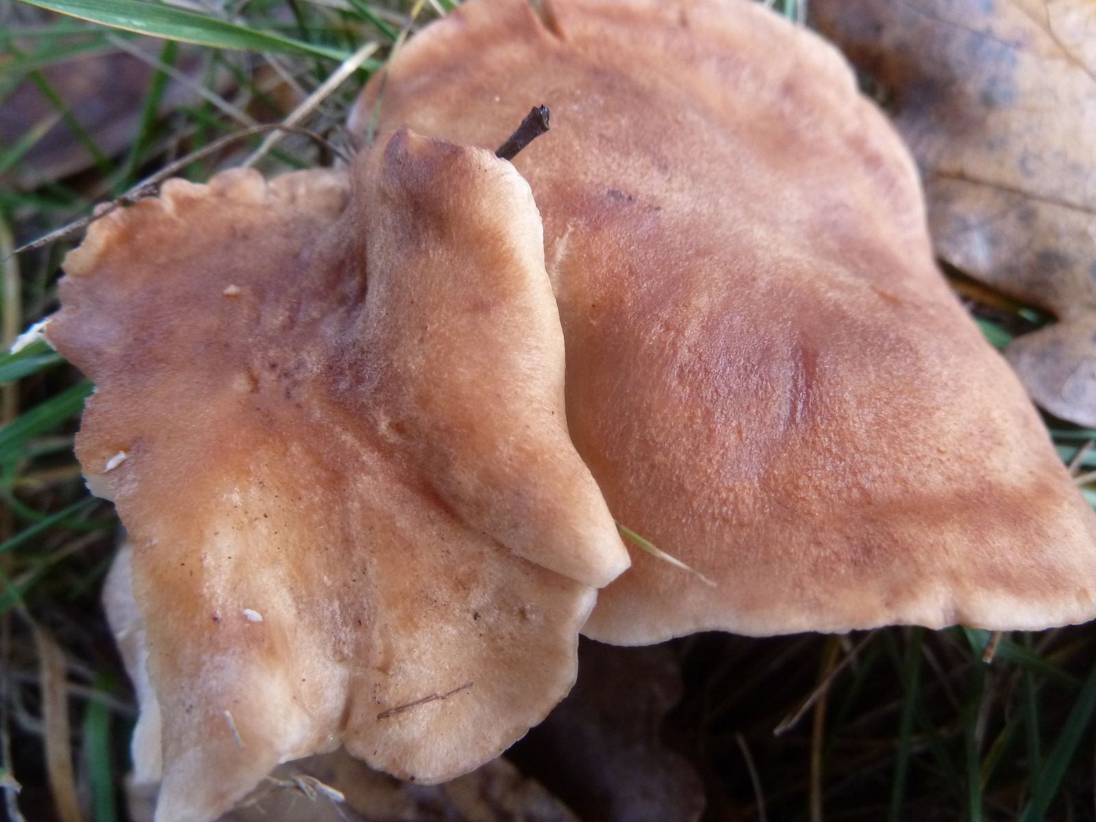 Diese etwas büschelig wachsenden Exemplare habe ich heute unter einer sehr alten Eiche gefunden. Ansonsten war da noch Wildkirsche und einiges Gestrüpp in der Nähe. Wegen dem Burggraben würde ich eine Tricholoma vermuten. Wenn ich nicht schon die falsche Gattung erwischt habe und mich bei Tricholoma umsehe, könnte das vielleicht ein Brandiger Ritterling sein? Der soll hauptsächlich bei Buchen wachsen und nur selten bei Eichen zu finden sein.