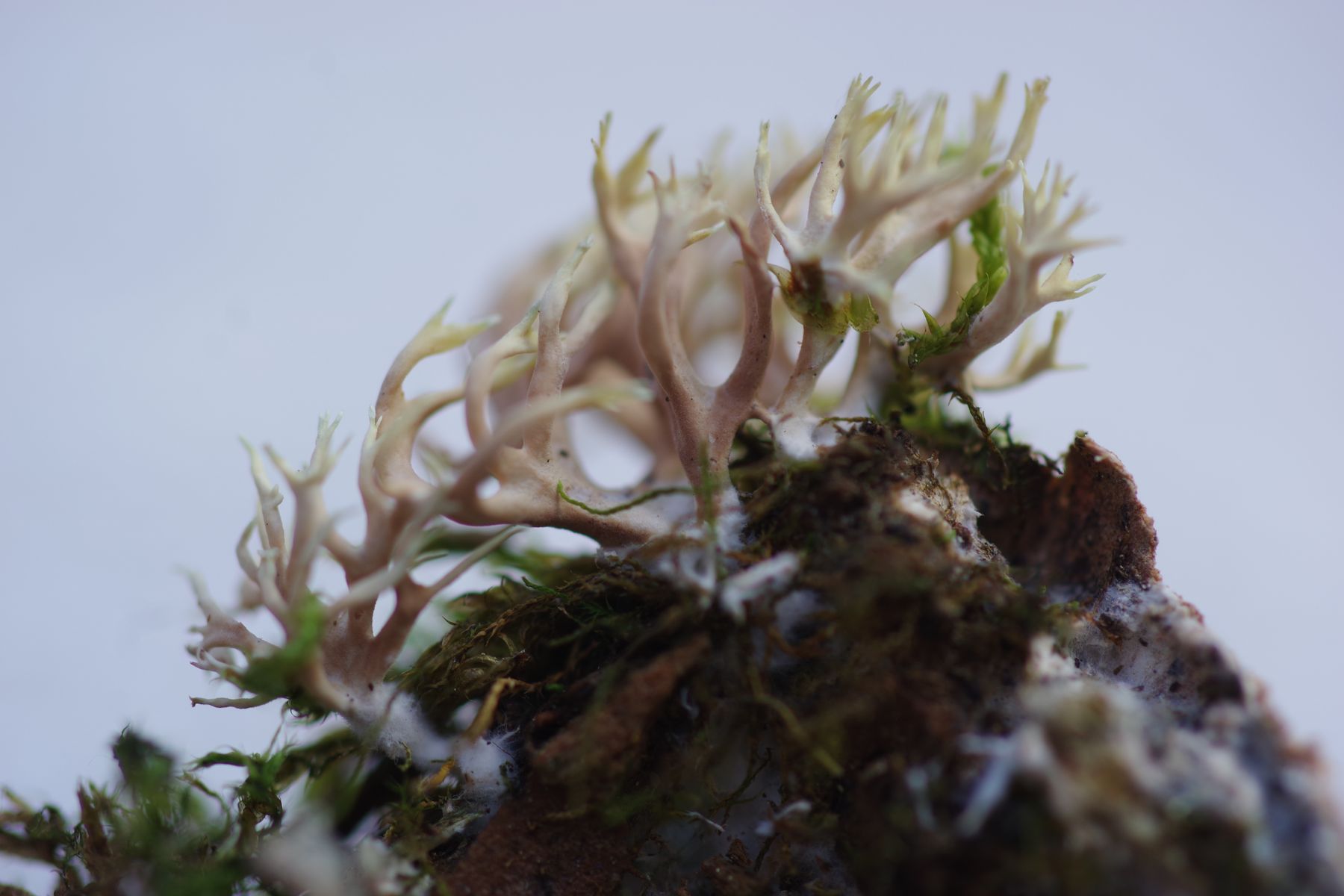 • Hallo, zweifellos eine gealterte Koralle, in etwa 2 m Höhe im Moos auf schräg wachsender Salix fragilis. Etwa 15-20 mm hoch. Normalerweise schwärzen die Dinger doch nicht sondern sacken in sich zusammen, oder? Eigentlich dachte ich an Lentaria sp. Es hat zwar drei Tage nicht geregnet, aber bei trotzdem feuchter Luft und Nebel. Jedenfalls keine Dürre.