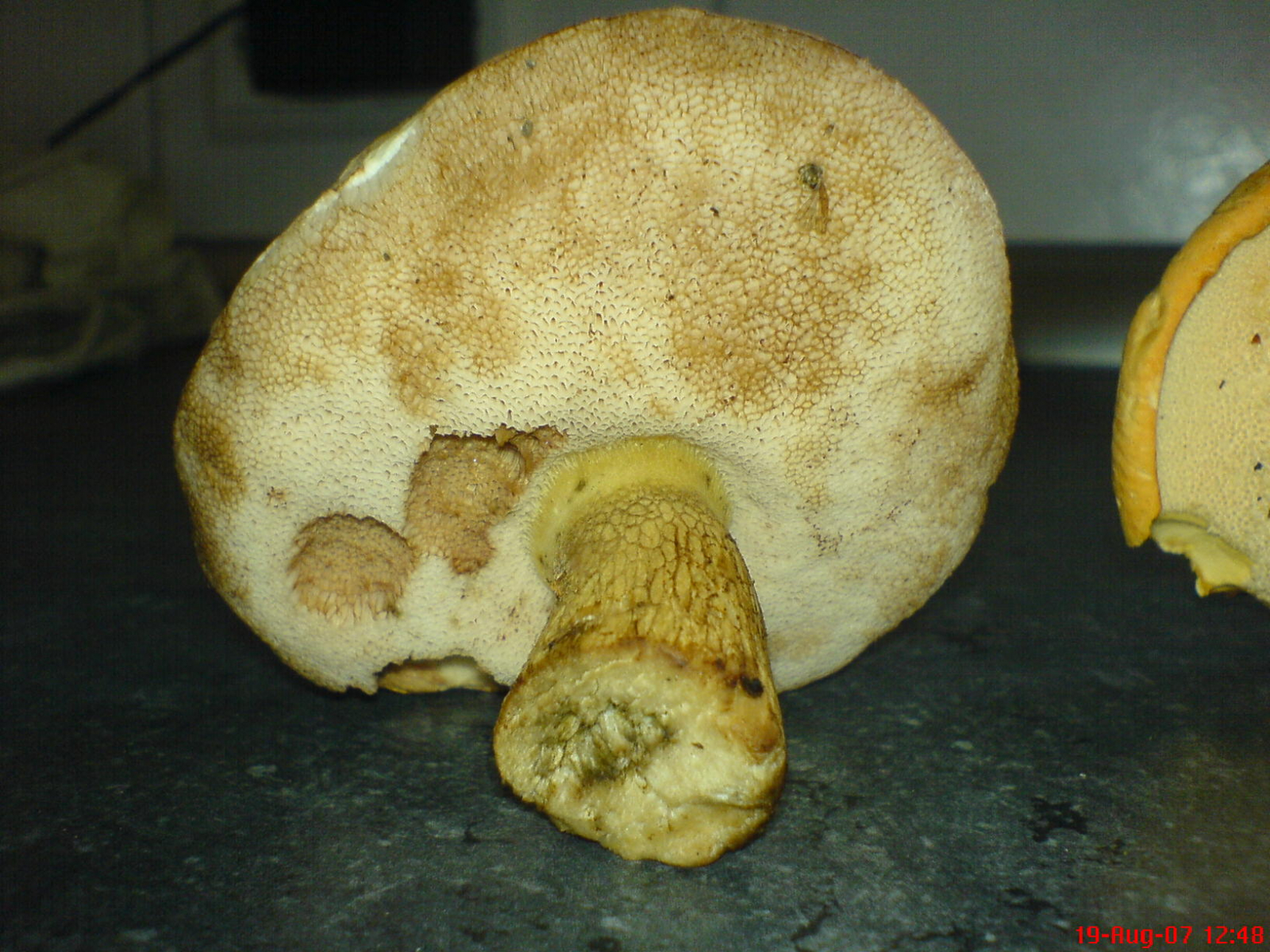 Bild 5, 6) Gallenröhrling (Tylopilus felleus). Gut zu erkennen am braunen Stielnetz und an den im Alter rosafarbenen Poren.