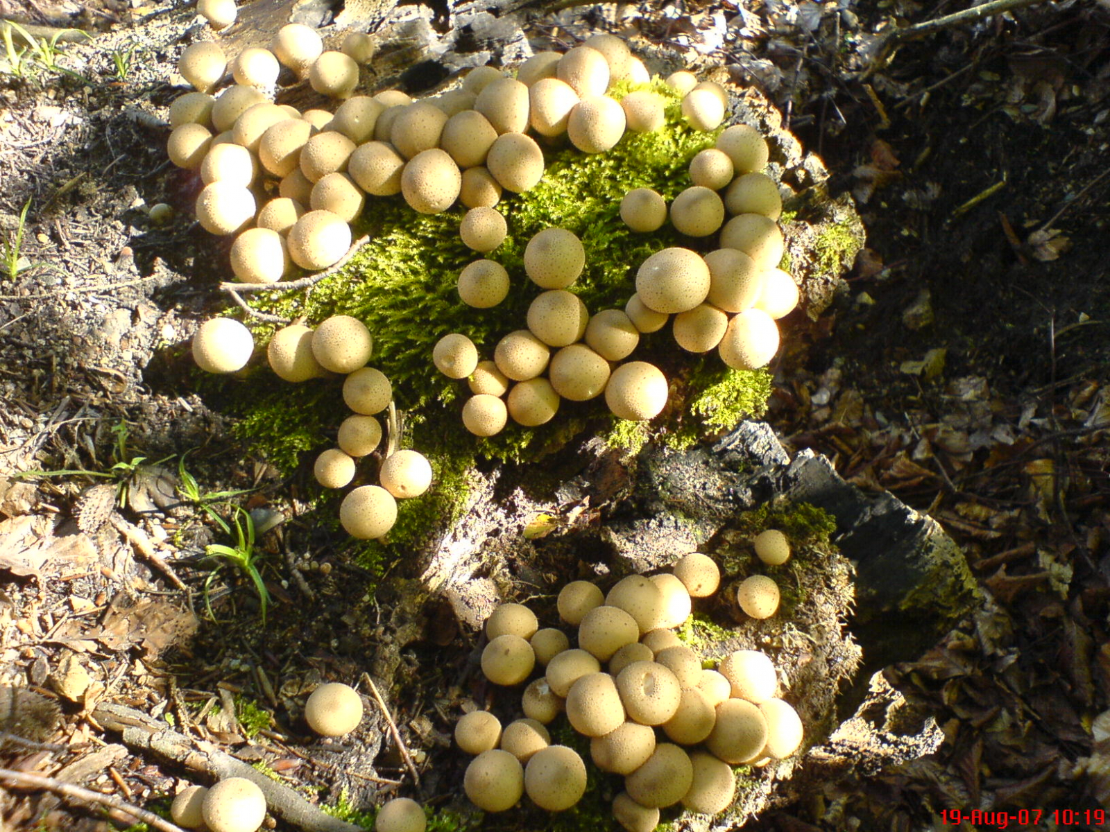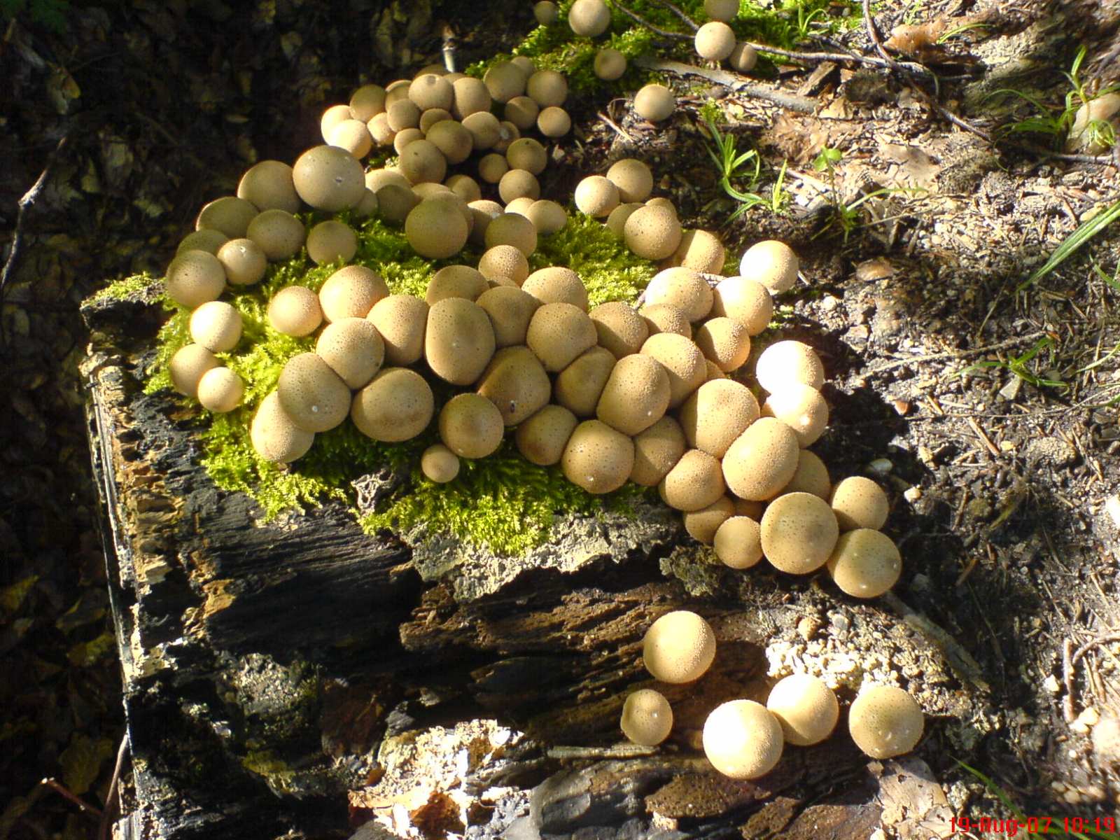 Bild 7, 8) Birnenstäubling (Lycoperdon pyriforme). Gut zu erkennen am büscheligen Wachstum, am direkten Vorkommen an Holz und an der grob- bis feinwarzigen Exoperidie (Aussenseite).