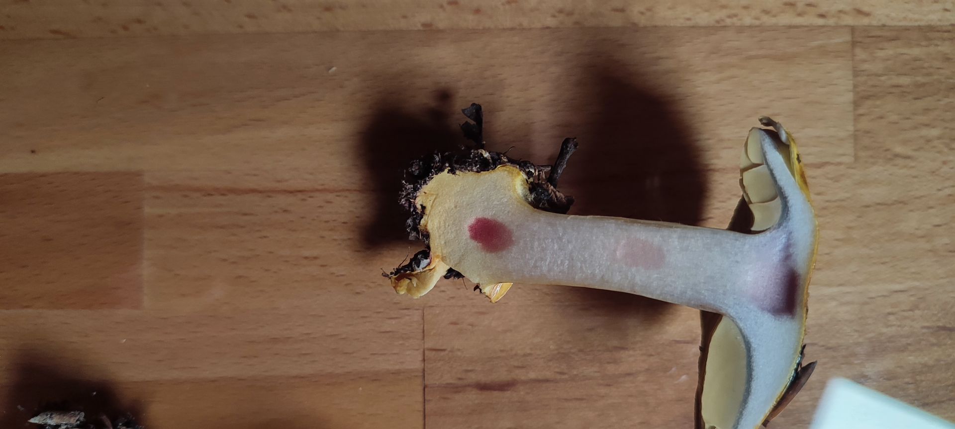 KOH20%: Huthaut = Blutrot, Knollenrand = Blutrot, Fleisch = rosa - leicht rötlich (hatte mein KOH leider nicht dabei, daher die Bilder bei Kunstlicht)
