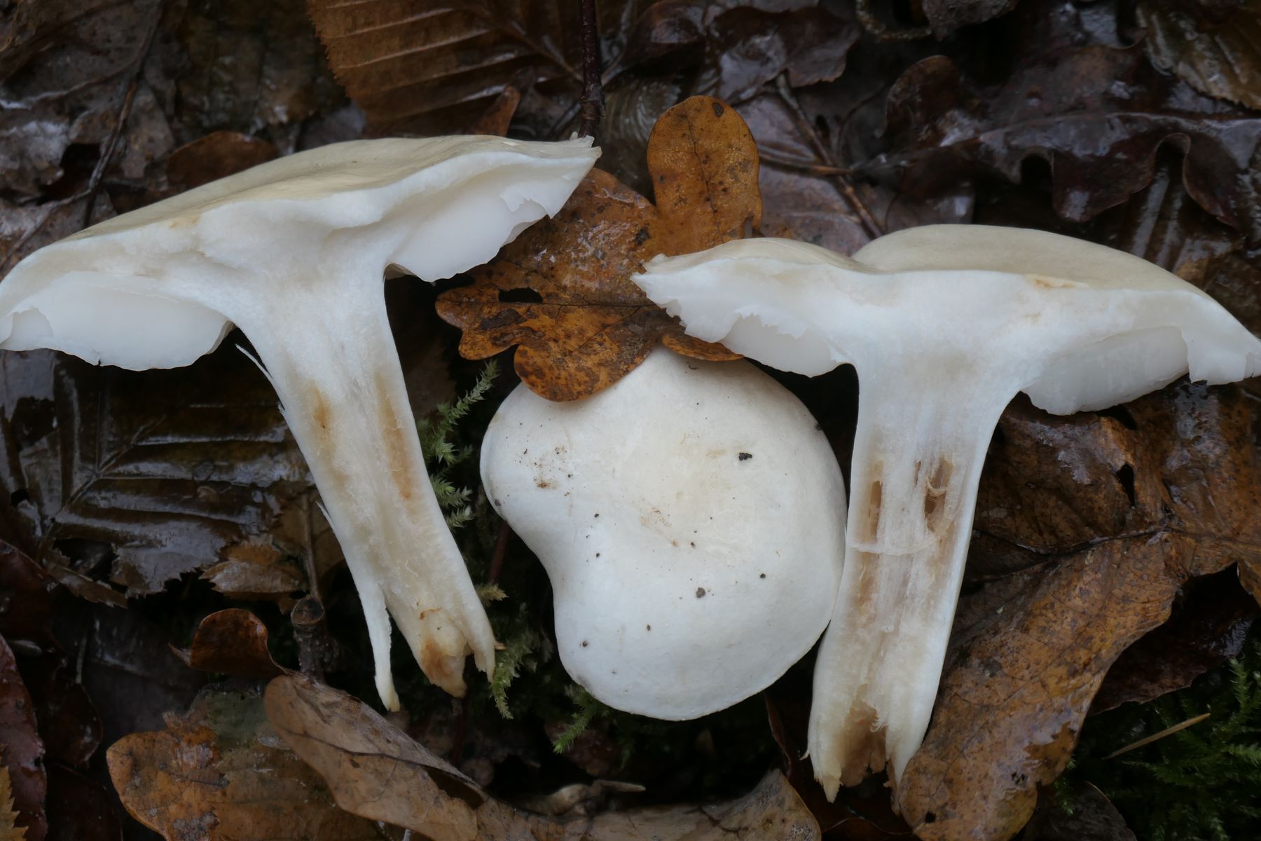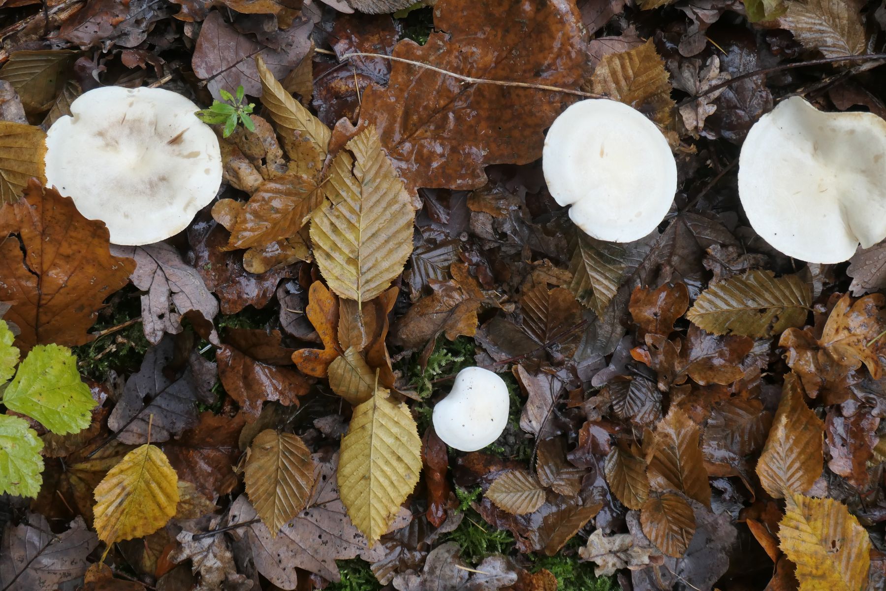 mehrere weisse Pilze, bei vermutetem Burgraben Ritterlinge?