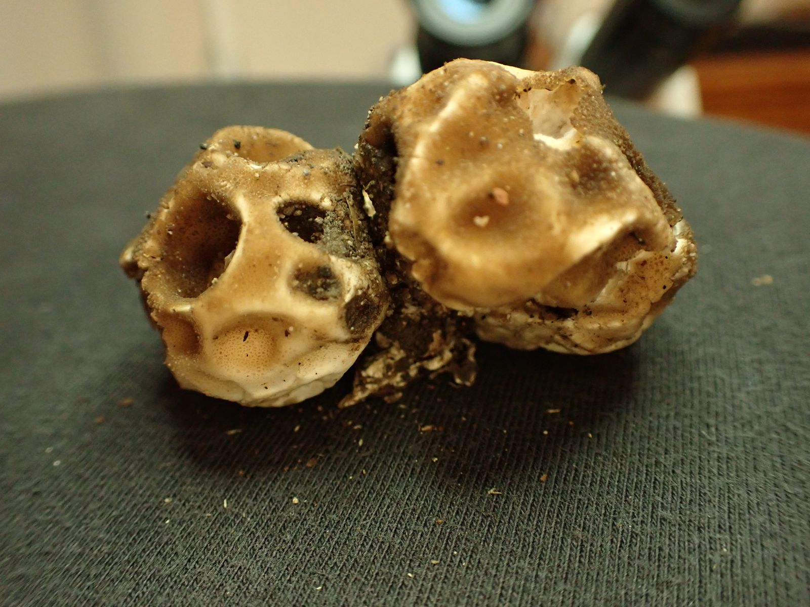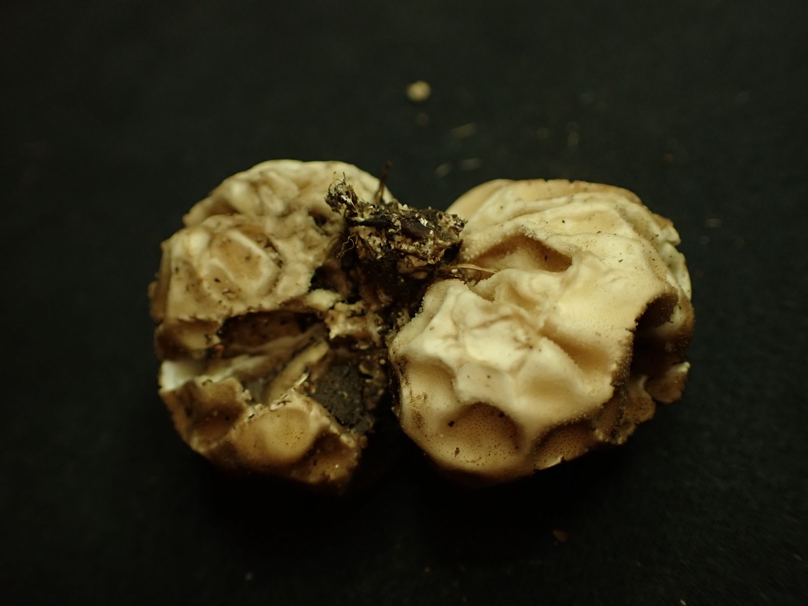 Die Form deutet darauf hin, dass sich die Gleba stark zusammengezogen hat und so eine Art "Unterdruck" erzeugt hat, die dann die Eindellungen verursacht haben. Aber was die Ursache dafür sein könnte - keine Ahnung.
