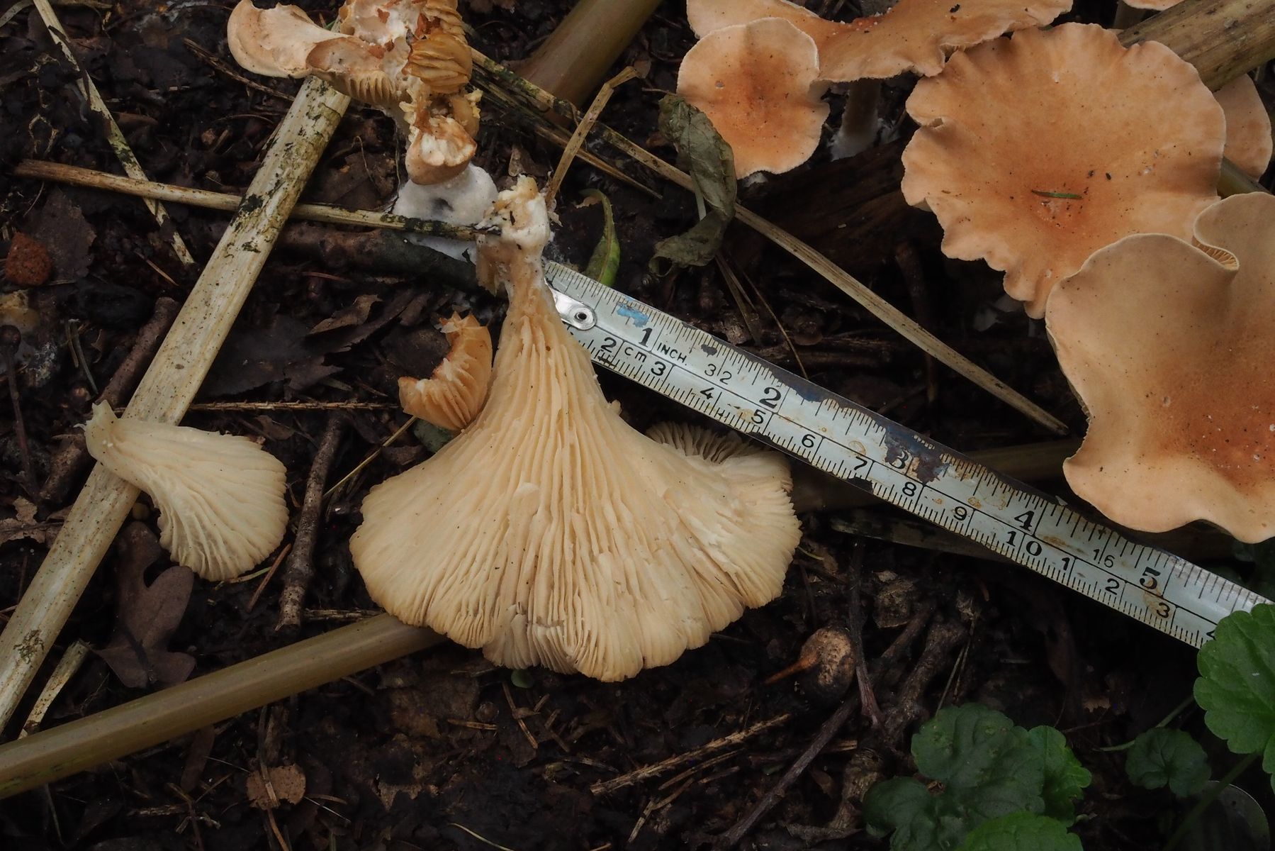 um keinen neuen Beitrag aufzumachen, möchte ich hier anfragen, ob ich wohl ebenfalls den Fuchsigen Röteltrichterling gefunden habe. Am 4. Oktober auf bereits seit einigen Jahren dort liegenden Laubabfall zwischen Drüsigem Springkraut fotografiert: