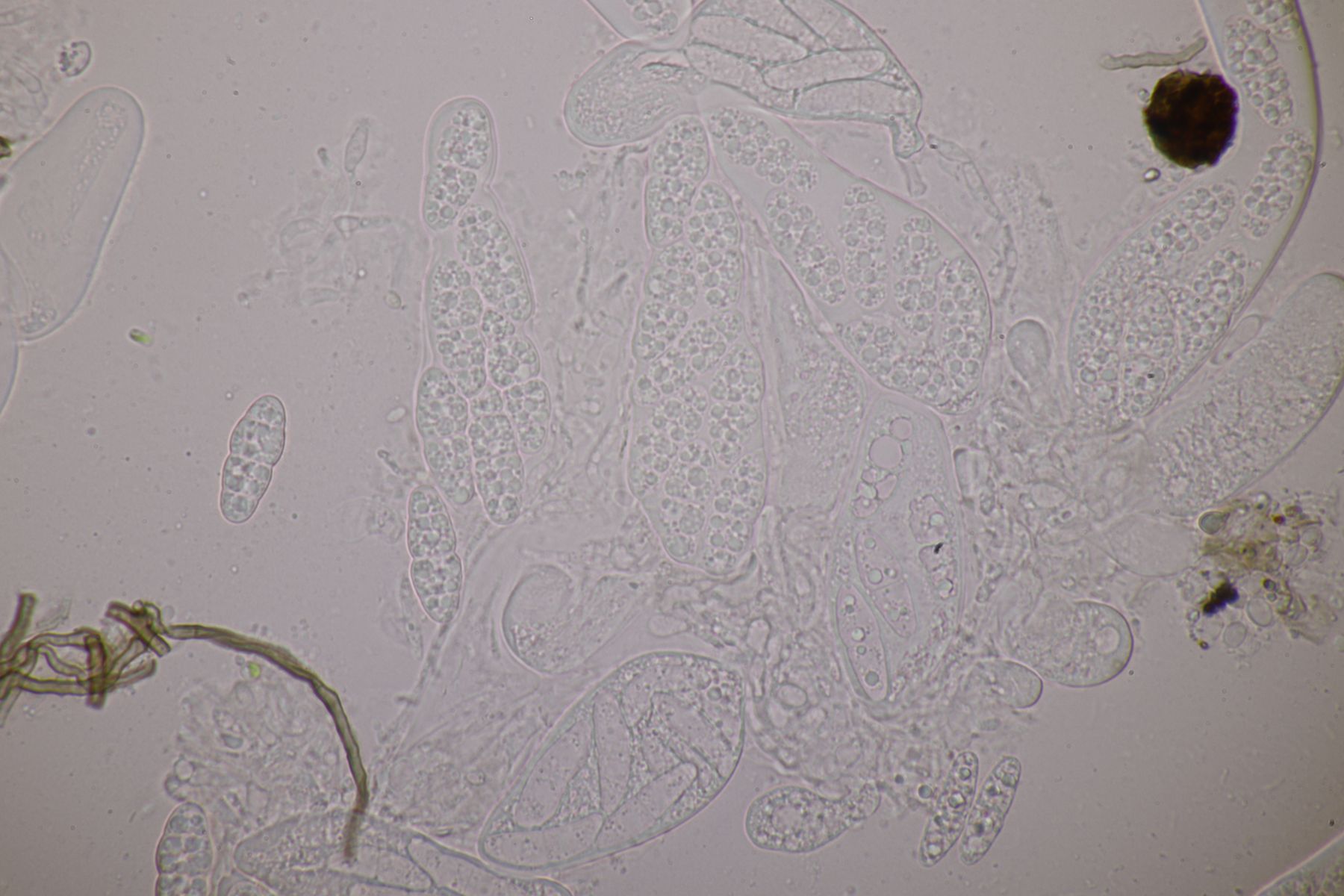 10. Noch eine Erdzunge, von der ich allerdings kein Makrofoto gemacht habe. Sporen im Abwurf 7-fach septiert, 86,5-96,4 µm x 4,7-6,0 µm, im Mittel 91 µm x 5,3 µm, Q=17.2+-2.0. Paraphysen an der Spitze verdickt, teilweise an Golfschläger einnernd und zum Teil eingerollt. Die Fruchtkörper waren nicht glitschig, Setae sind nicht vorhanden, so daß es also ein Geoglossum ist. Das paßt irgendwie alles nicht so richtig zu G. umbratile. G. cookeanum ist auch raus, aber was ist es dann?