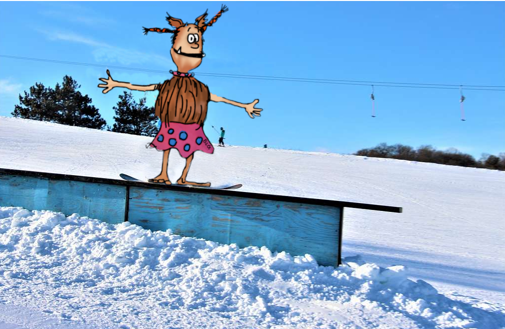 Und Fani hat sich auch schon wieder aus dem Staub gemacht. Es ist seit Tagen stürmisch und sie kann nicht angeln. Jetzt ist sie hier den Berg hoch ins Skizentrum gefahren und will "Snoboad faan lern' ".
