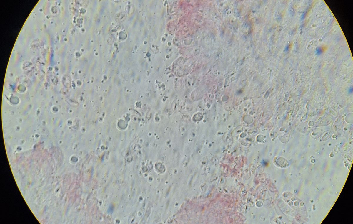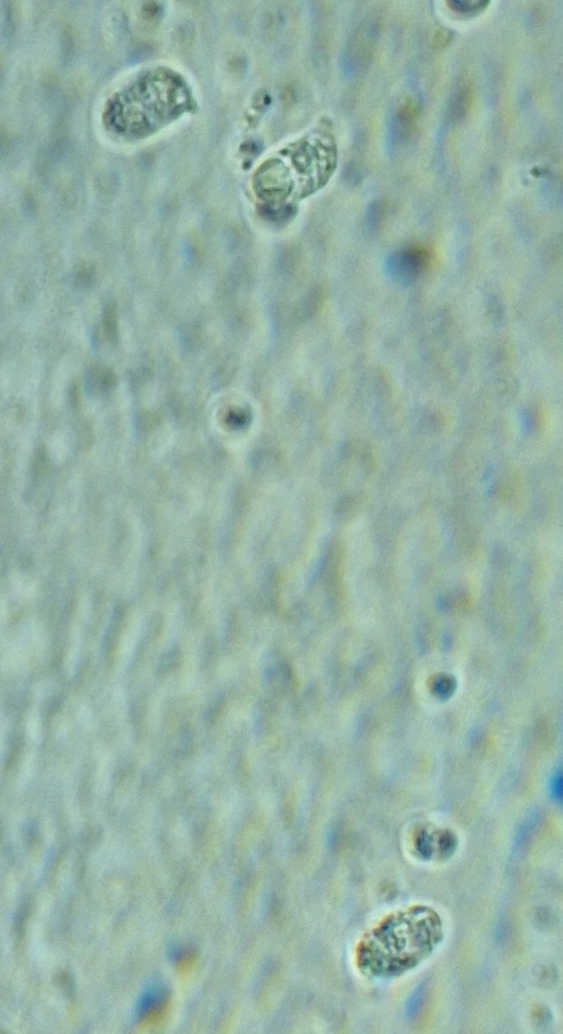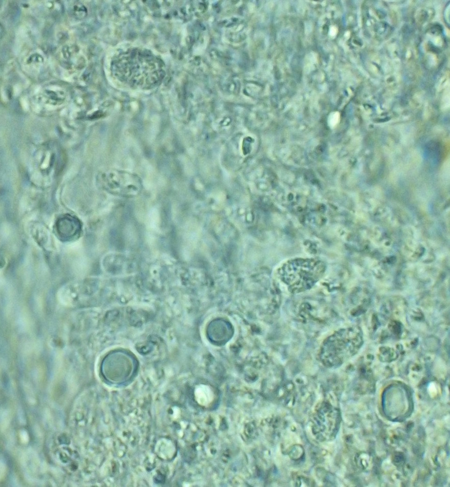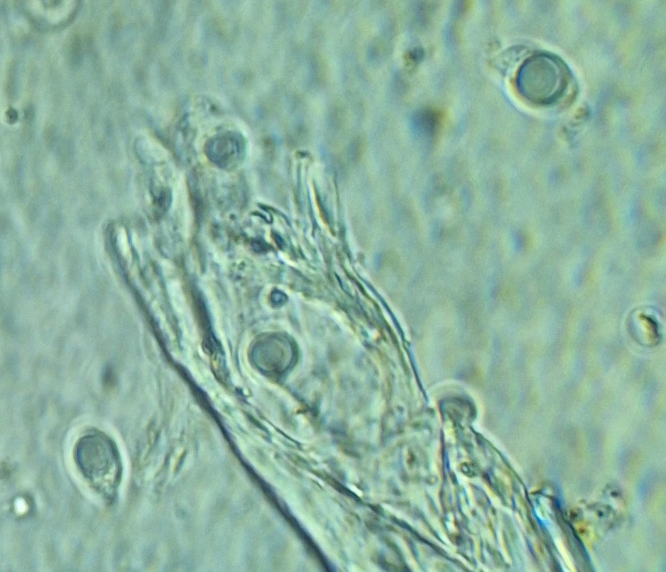 inzwischen habe ich mich auch an diesem Pilz mikroskopisch versucht, zunächst nur mit einem Stück Lamelle. Ungefärbt.