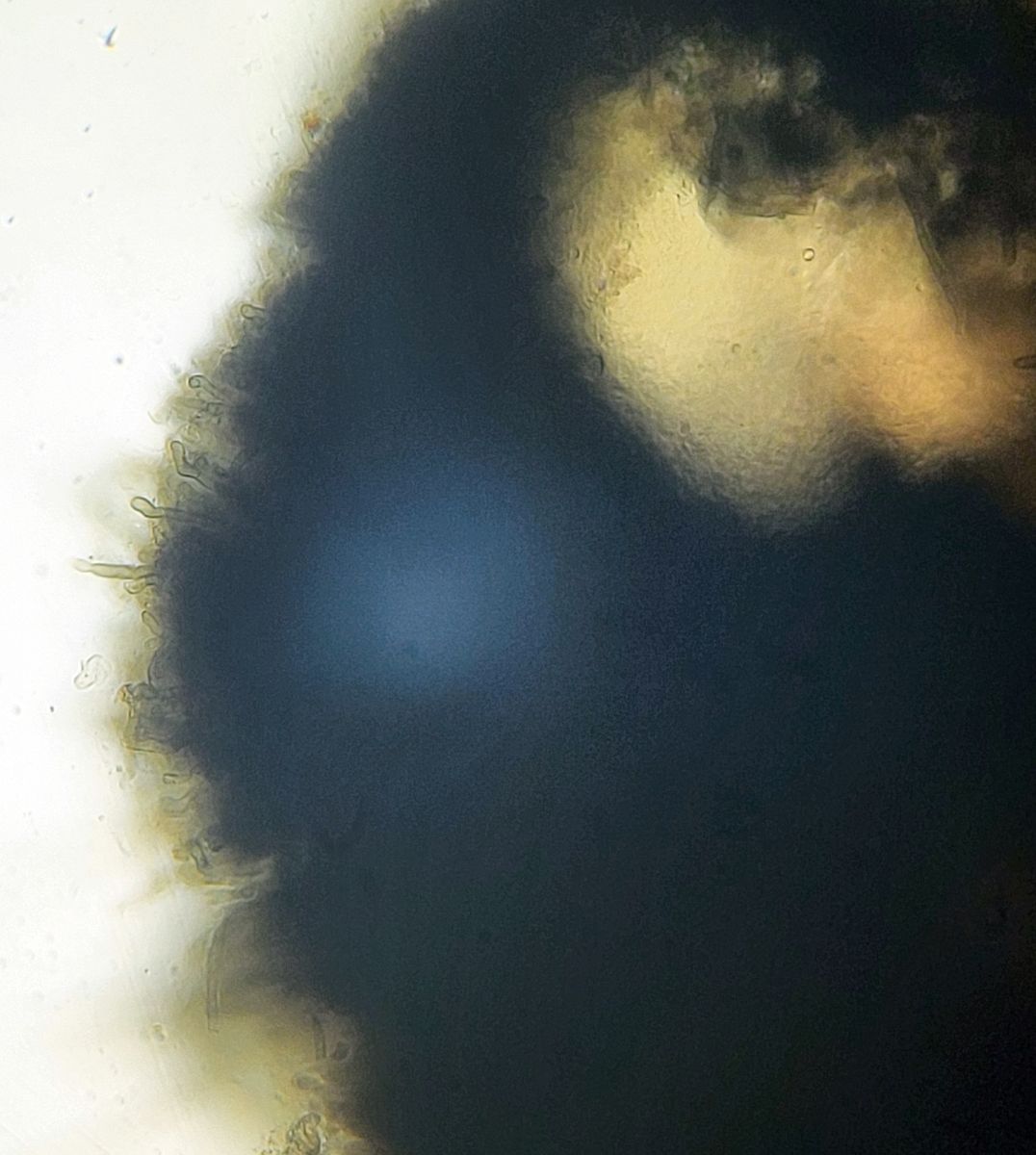 Der nächste Fund dann mit einem „cf“: Kleistothecien mit kleinen Clustern aus rundlichen Sporen (Durchmesser um die 2,5 µm) passen wohl ganz gut zu Nigrosabulum globosum. Kann die Art bestätigt werden?
