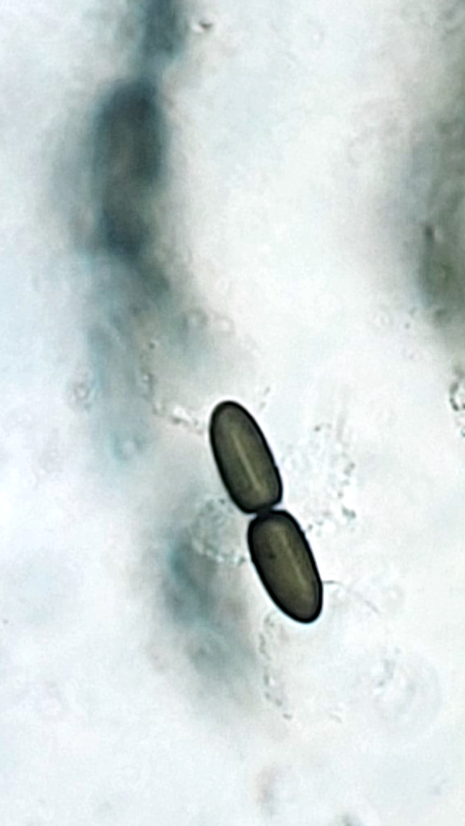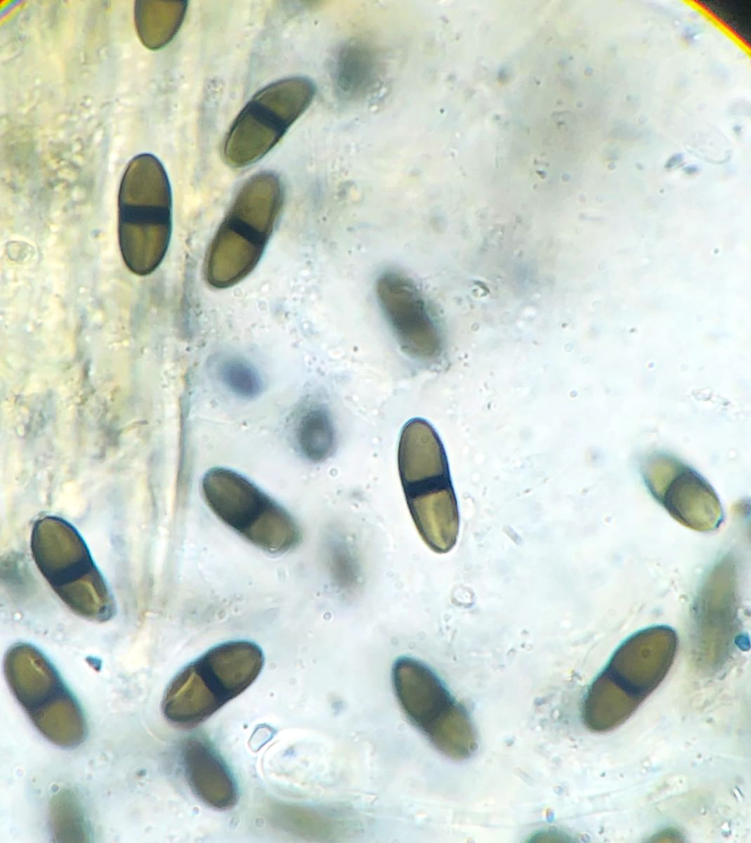 Etwas Kopfzerbrechnen bereitete mir der folgende Fund, da ich die Art bisher nicht mit so losen Sporenclustern gesehen hatte. Die Sporenmaße passen allerdings und Björn bestätigte, dass die Art auch mal dergestellt auftreten kann: Saccobolus depauperatus
