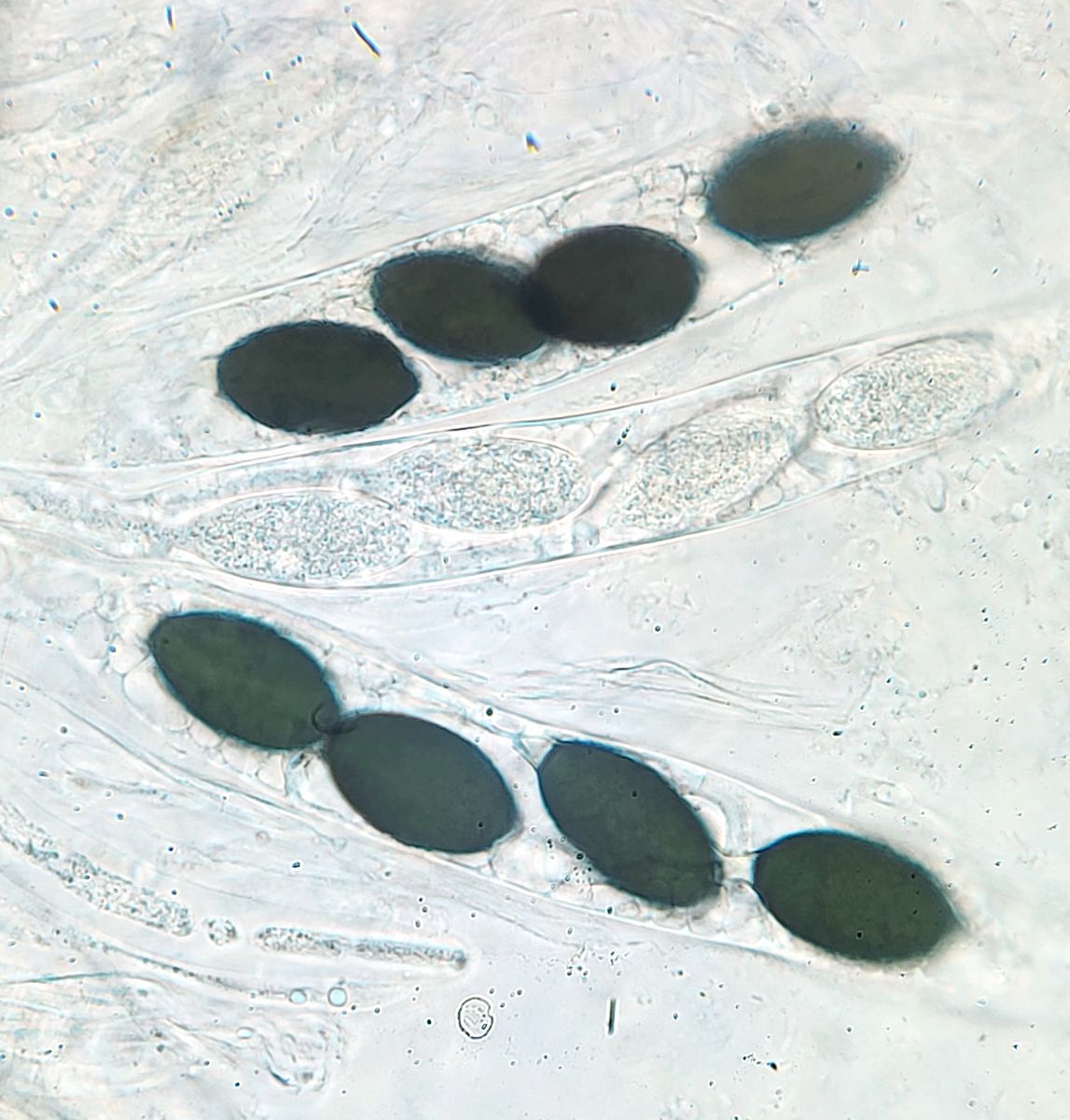 Ein besonders schöner Fund gelang mir dann auf Pferd. Bislang hatte ich erst eine Art mit mehr als 4 Zellen pro Spore gefunden (Sporormiella affinis), dies ist nun Nummer 2: mit 7 Zellen pro Spore hört die Art auf den Namen Sporormiella heptamera