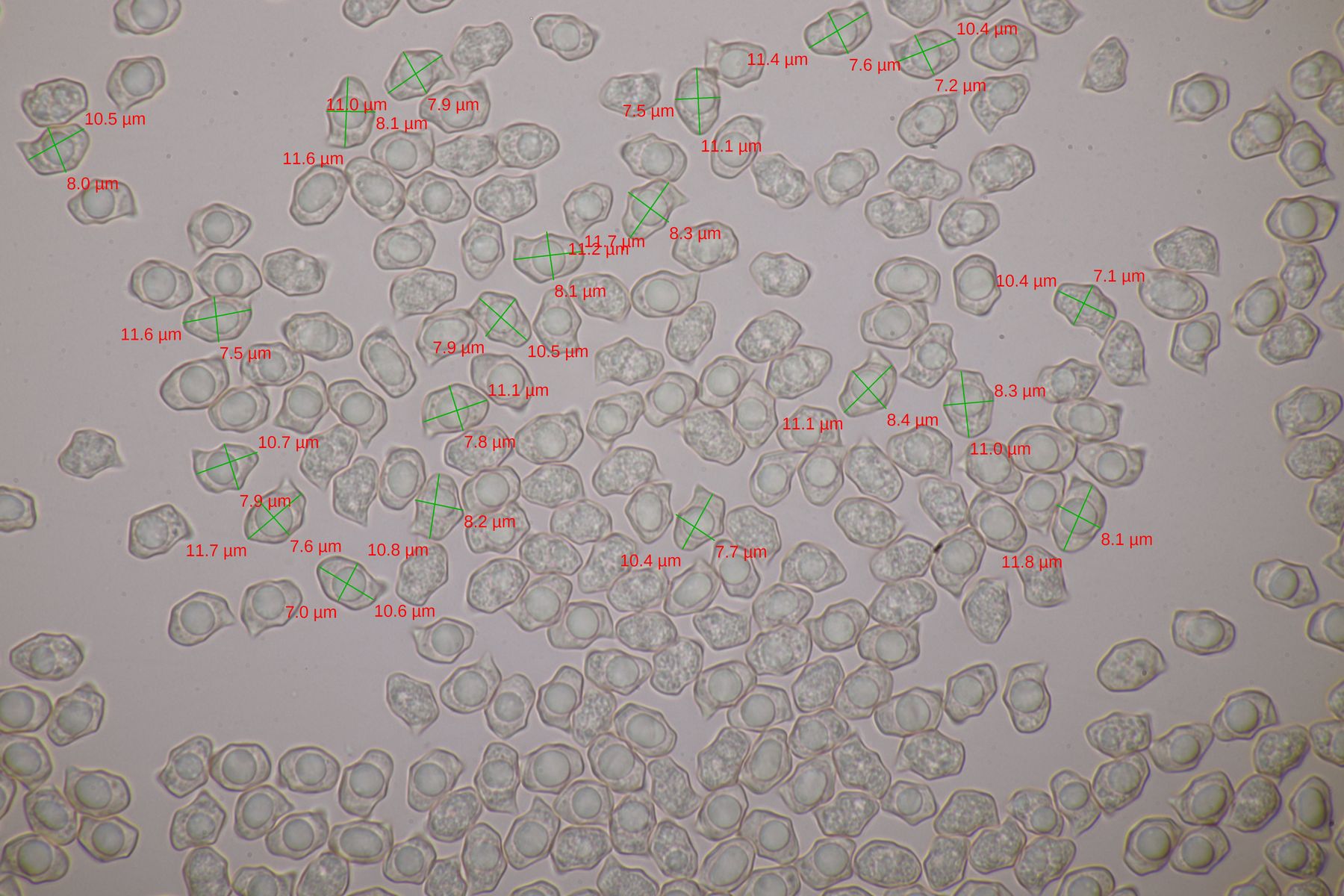 PS: Die genaue Messung der tatsächlichen Größe von Sporen, z. B. des Volumens wurde zwar schon öfters mal angestrebt mit Näherungsberechnungen. Die sind allerdings (meines Erachtens) nicht aussagekräftiger für eine Bestimmung als die einfachen Längen-/Breitenmessungen.