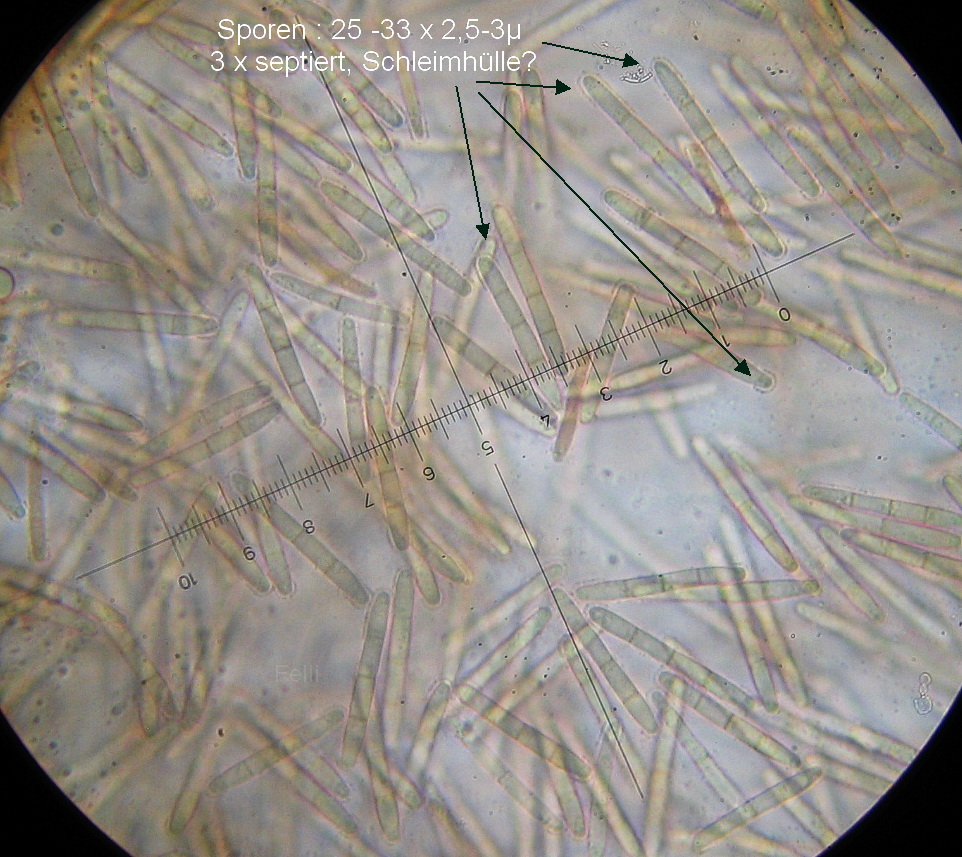 Ich nehme an, dass sich die Sporen in Ketten bilden und in einer Schleimmasse sind, da ich keine Strukturen fand an welchen sie entstehen könnten.