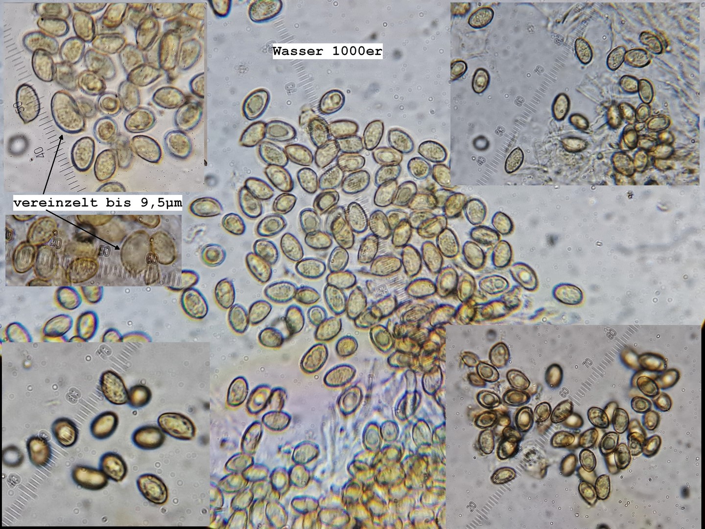 Immer wieder im Präparat zerstreut, einzelne große Sporen von 9-9,5µm, jedoch 2sp Basidien (Vermutung) haben wir nicht gesehen.