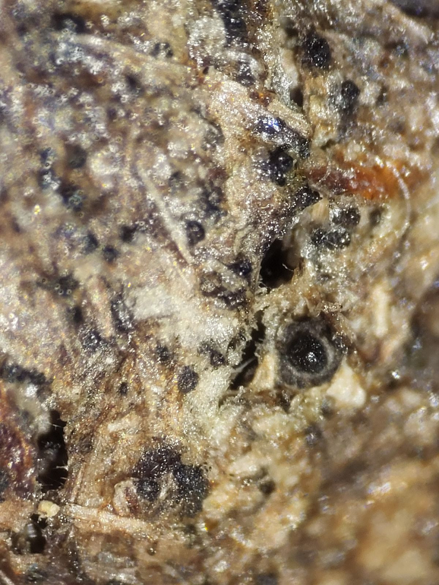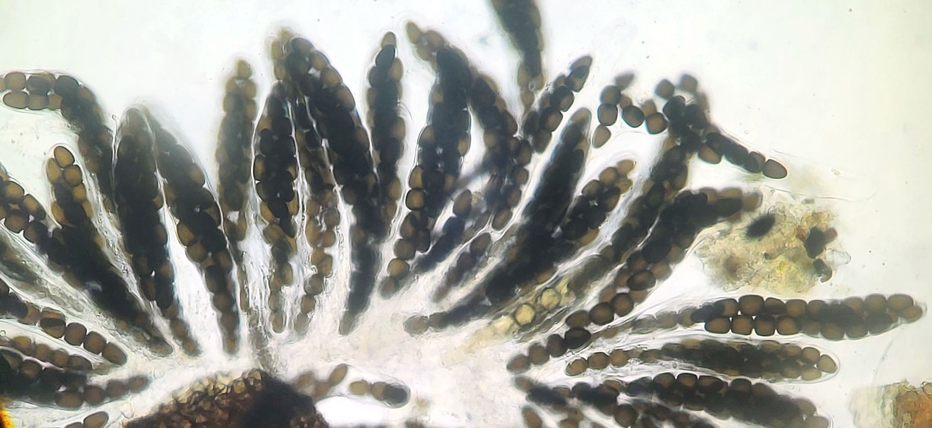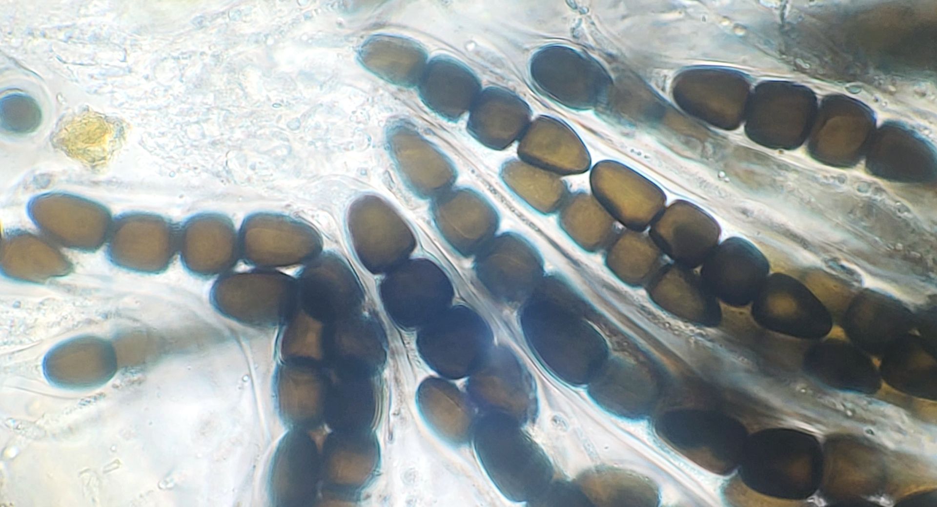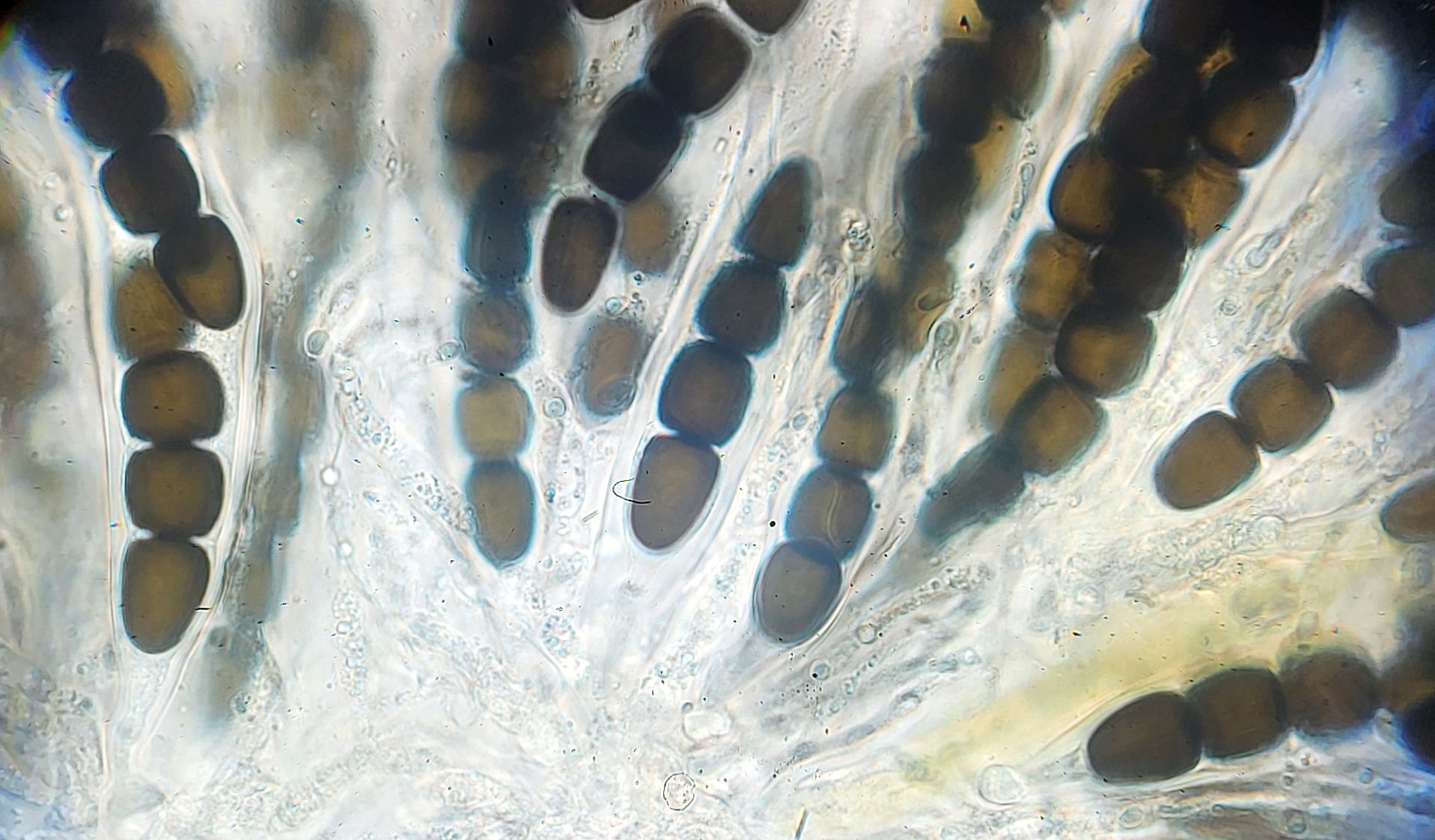 1. Eine Chaetomium (oder eine verwandte Gattung) auf Birkhuhn. Die Fruchtkörper sind etwas länglich und dicht mit gräulichen Haaren überzogen. Die Haare sind mikroskopisch rau, unverzweigt und teils korkenzieherartig aufgerollt. Die Mikromerkmale finde ich ansonsten so bemerkenswert, dass ich darauf hoffe, dass die Art bestimmbar ist: Die Asci sind zylindrisch und die Sporen haben eine sehr auffällige Form, die ich als limoniform betrachten würde. Gemessen habe ich die reifen Sporen mit 10, - 11,3 x 6,8 - 8 µm.