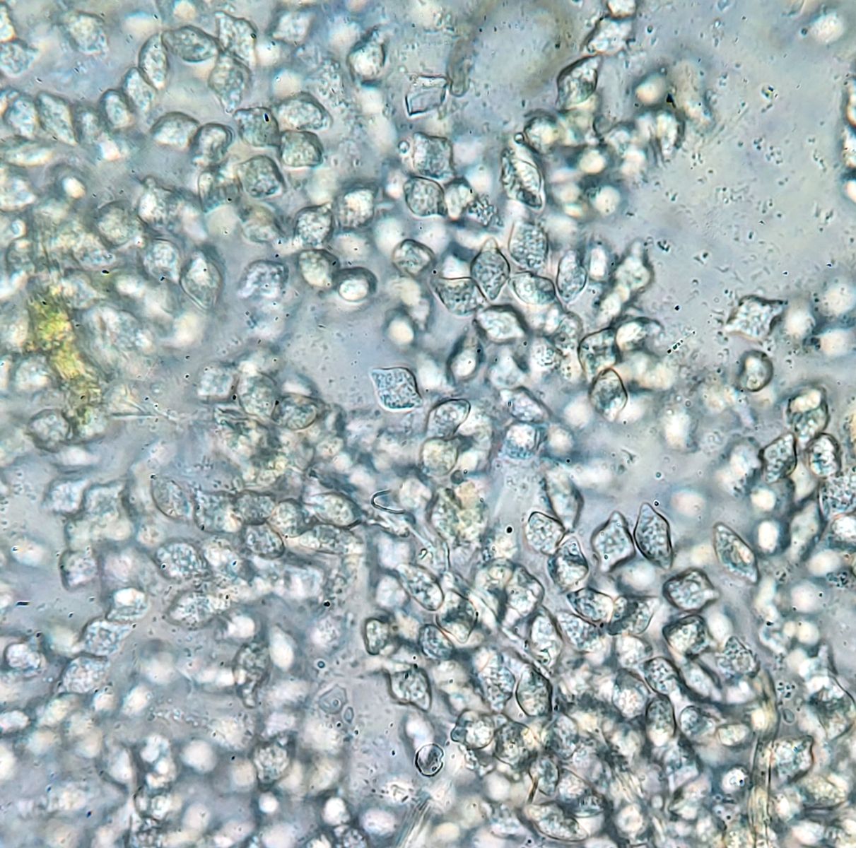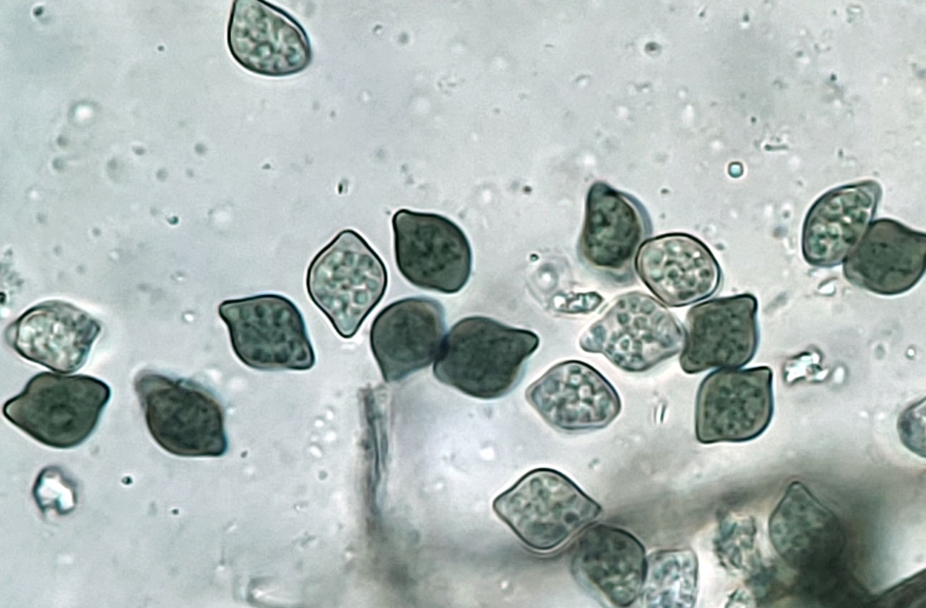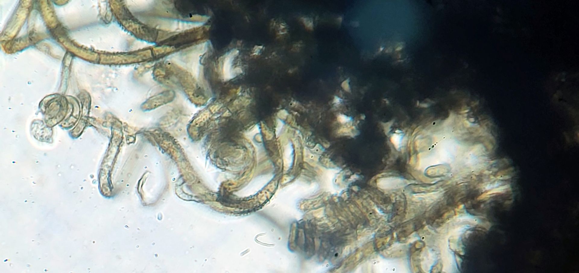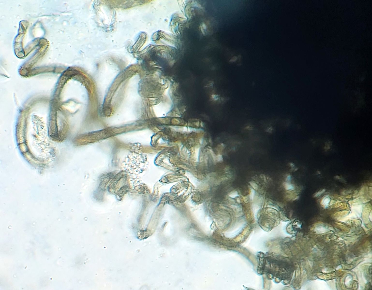 1. Eine Chaetomium (oder eine verwandte Gattung) auf Birkhuhn. Die Fruchtkörper sind etwas länglich und dicht mit gräulichen Haaren überzogen. Die Haare sind mikroskopisch rau, unverzweigt und teils korkenzieherartig aufgerollt. Die Mikromerkmale finde ich ansonsten so bemerkenswert, dass ich darauf hoffe, dass die Art bestimmbar ist: Die Asci sind zylindrisch und die Sporen haben eine sehr auffällige Form, die ich als limoniform betrachten würde. Gemessen habe ich die reifen Sporen mit 10, - 11,3 x 6,8 - 8 µm.