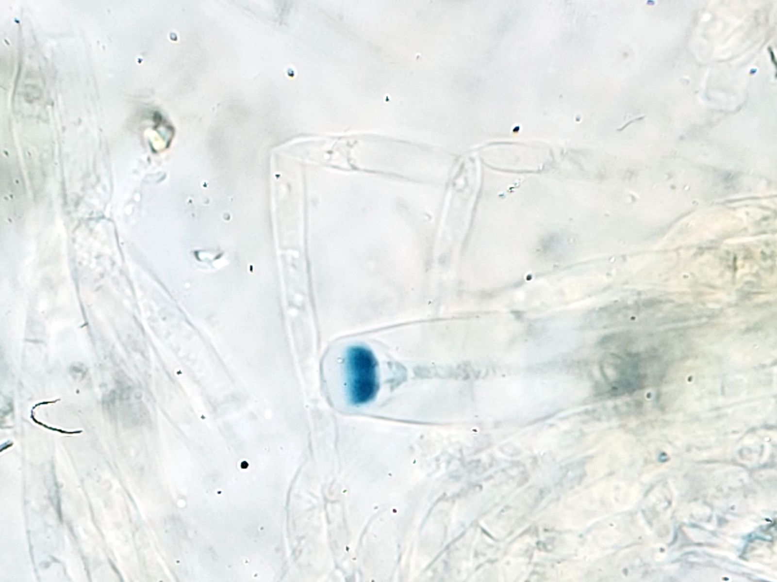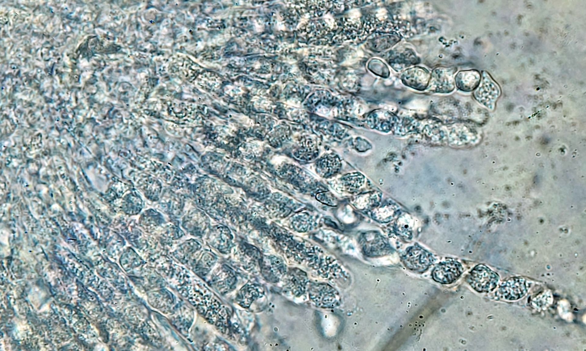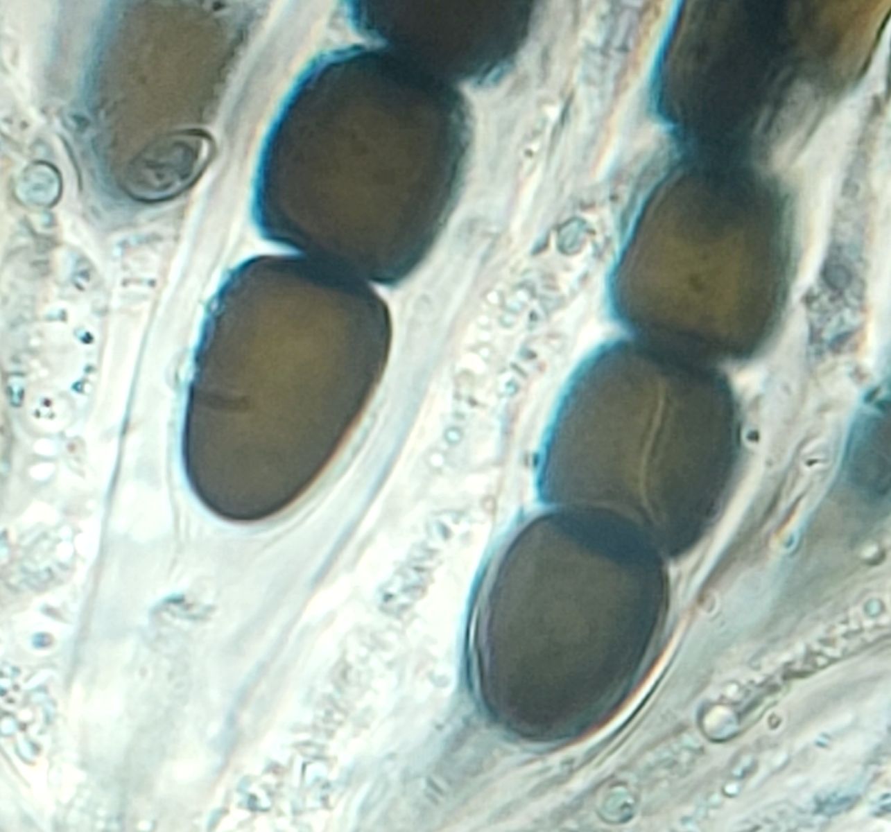 3. Eine Sporormiella, ebenfalls auf dem Schaf. Die war tief im Substrat versenkt und daher ein Zufallsfund, den ich versehentlich angestochen habe, so dass ich kein Makrobild dazu habe. Die Sporen sind 4zellig und tief septiert, die Maße betragen 67 - 69 x 13,8 - 14,3 µm. Die Keimspalte würde ich als leicht schräg bezeichnen, wobei sie oben und unten jeweils deutlich abknickt. Die Endzellen sind spitz zulaufend. Die Asci messen 200 - 210 x 25 - 28 µm, haben eine kurze kräftige Ascuswurzel und die Sporen liegen darin recht kompakt in im Mittelteil teils leicht versetzten 3-4er Reihen. Mir würde für den Fund der Name Sporormiella systenospora gefallen, jedoch mit leichter Unsicherheit bei der Bestimmung.