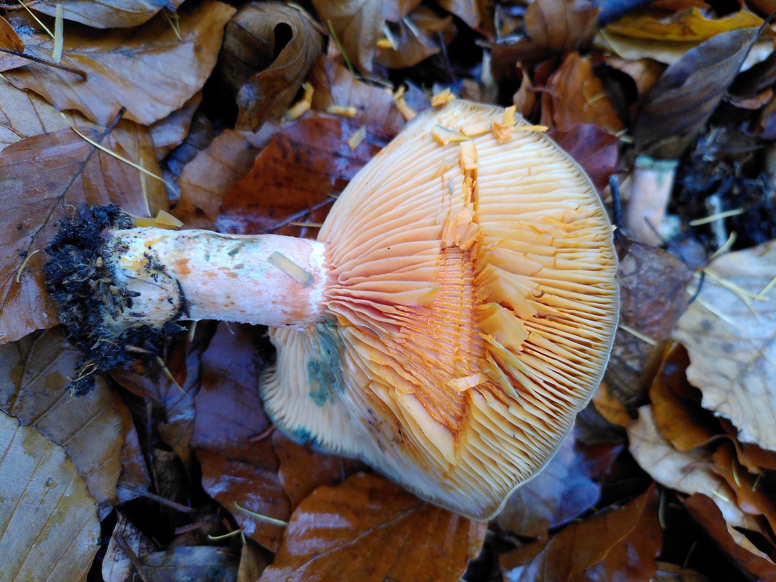 Anderseits irritieren mich diese L. deliciosus-typischen Flecken am Stiel des Jung-Exemplars schon etwas, die ja wieder mehr für den Edel-Reizker sprechen würden als wie für den Wechselblauenden. :gskeptisch: