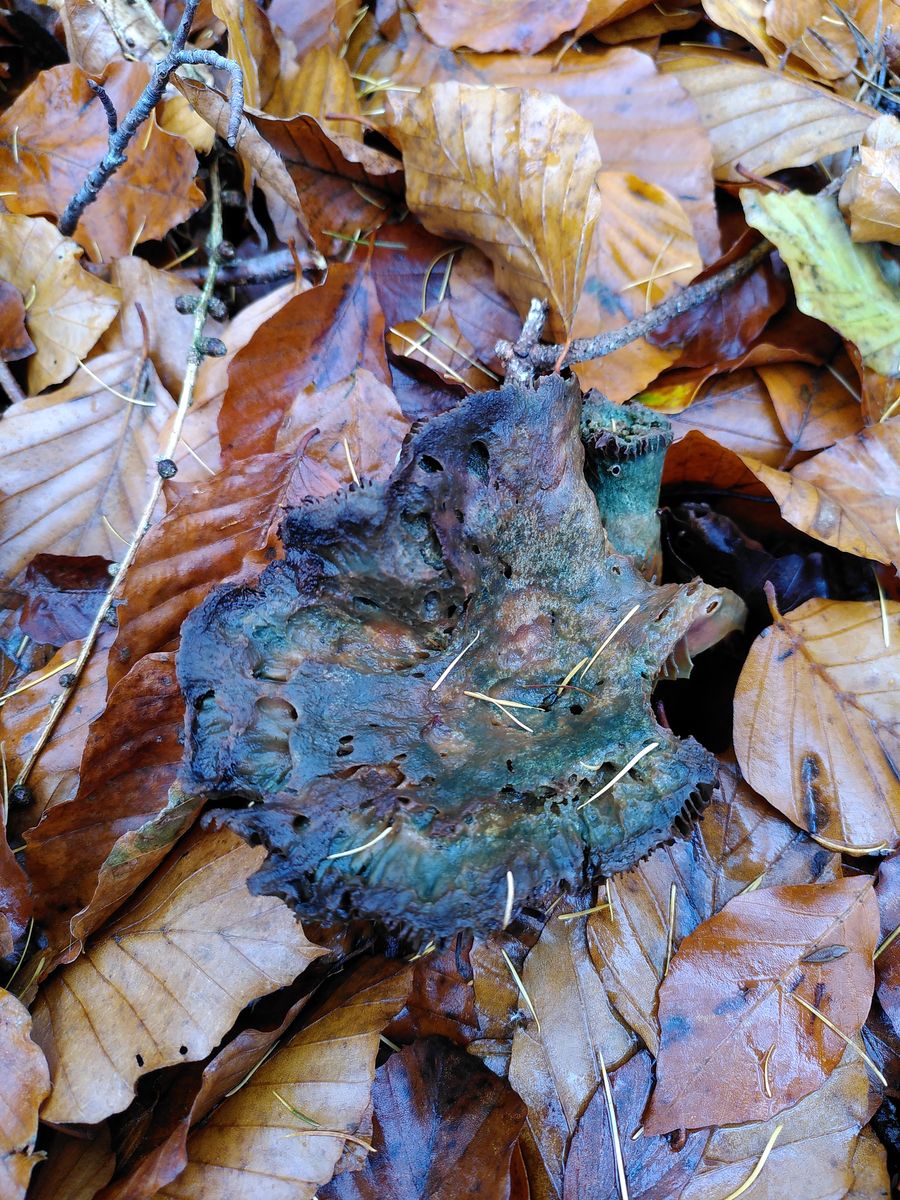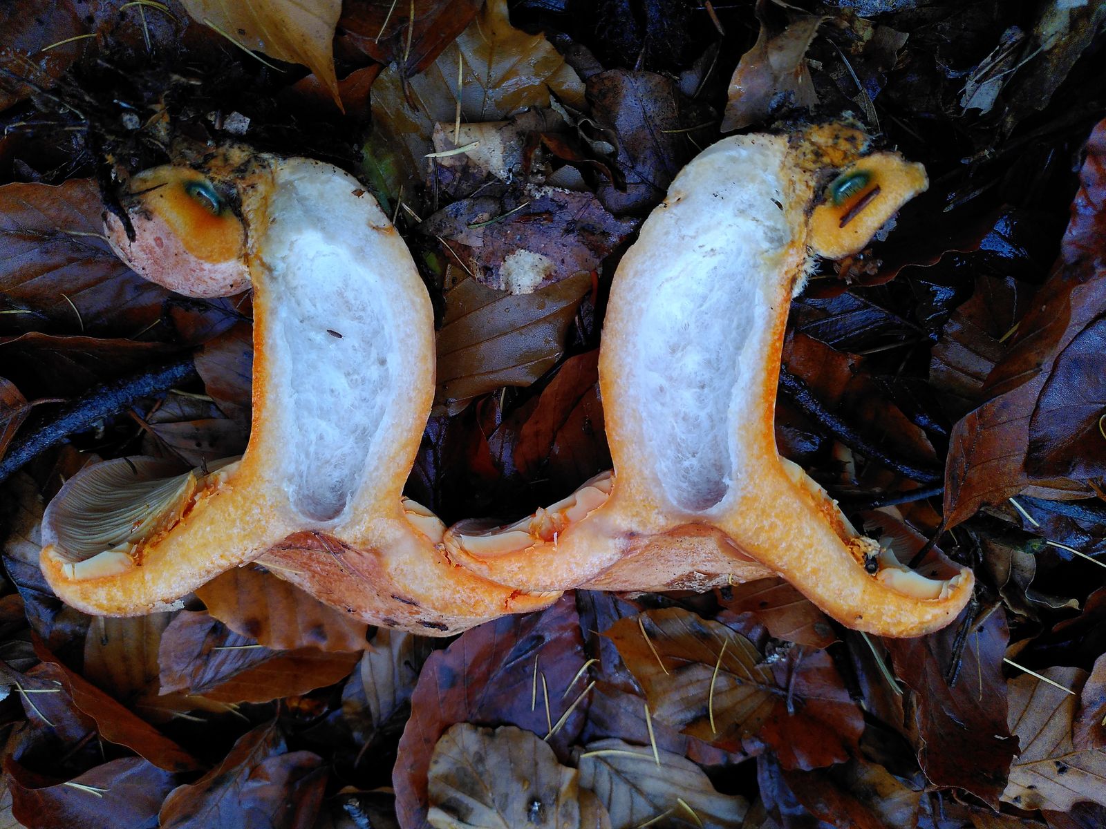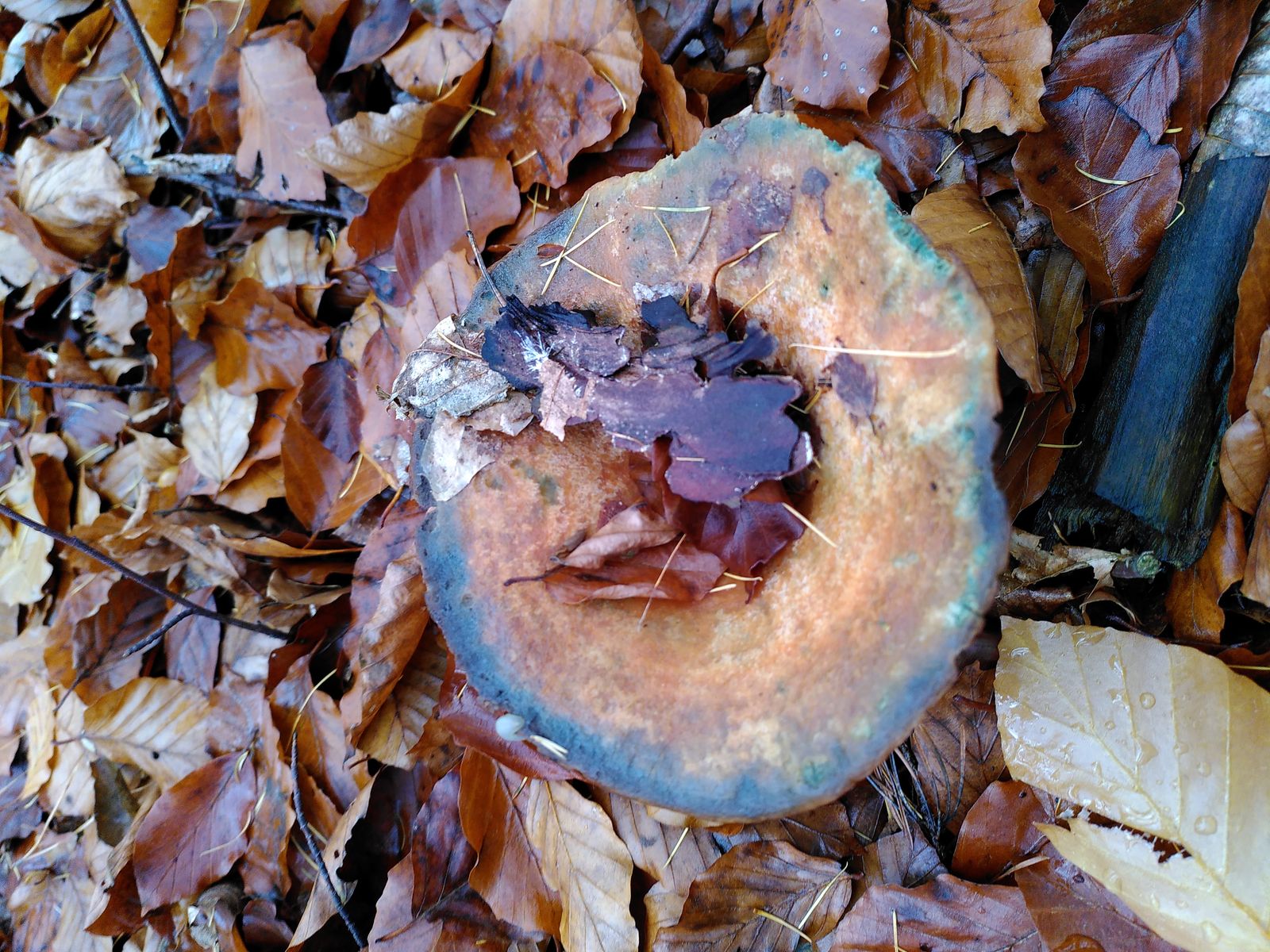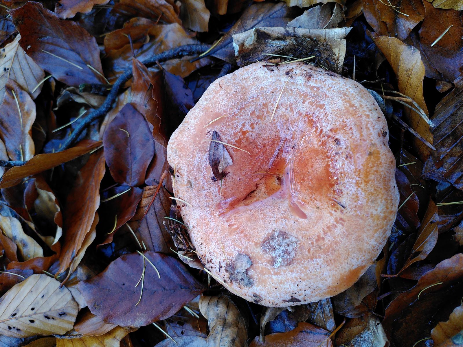 Diesen Reizker-Fund aus einem Buchenwald mit einzelnen Kiefern im November möchte ich deshalb hier gerne noch zur Diskussion stellen. Tannen oder Fichten gab es dort nicht. Mit dieser Voraussetzung bleiben eigentlich nur L. sanguifluus, L. semisanguifluus, L. quieticolor und L. deliciosus. Nachdem ich mir die Arten im Kibby nochmal genau angeschaut habe, lande ich am ehesten beim Edelreizker (Lactarius deliciosus).