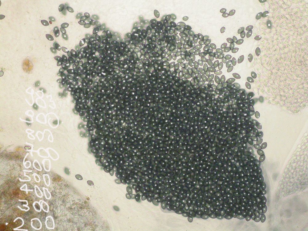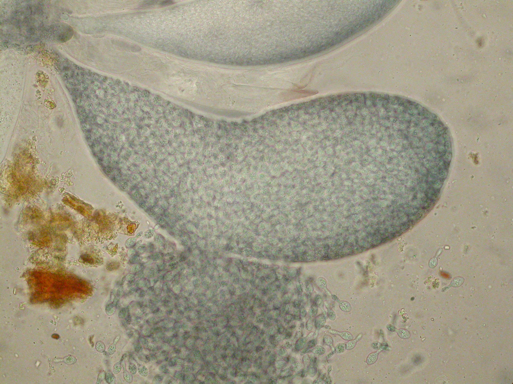 Asci 1024-sporig. Ascosporen zweizellig, mit brauner Sporenzelle und Pedicel. Apikal hat die Sporenzelle eine dünne Cauda. Pedicel ist relativ kurz mit 4-5 µm. Bei jungen Sporen ist das Pedicel