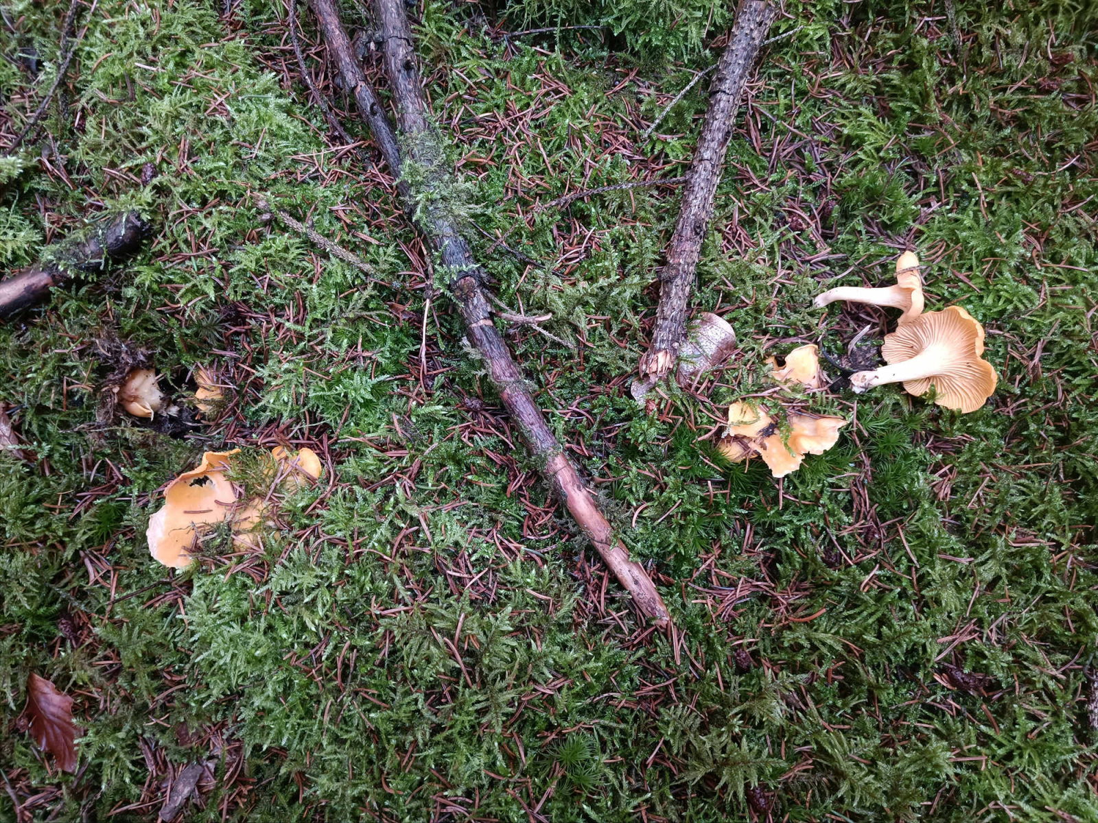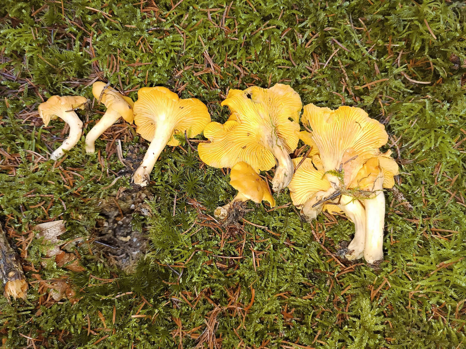 Ich fand frisch gewachsene Exemplare des Cantharellus cibarius, dem Echten Pfifferling.