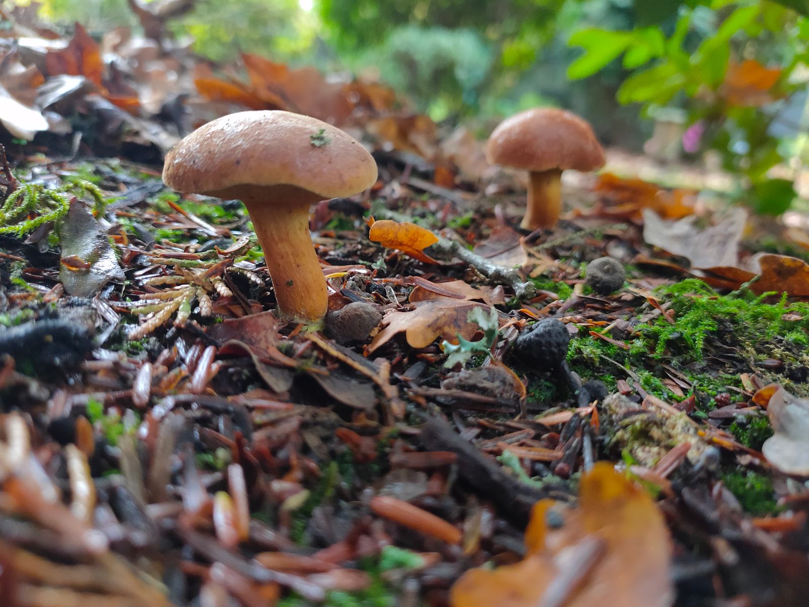 • 2. Suillus: Röhrling mit Nadelholzbegleiter, ich meine es wäre Läche gewesen? Recht kleine 3-5 cm mit einem raunen Hut, leicht schmierig.