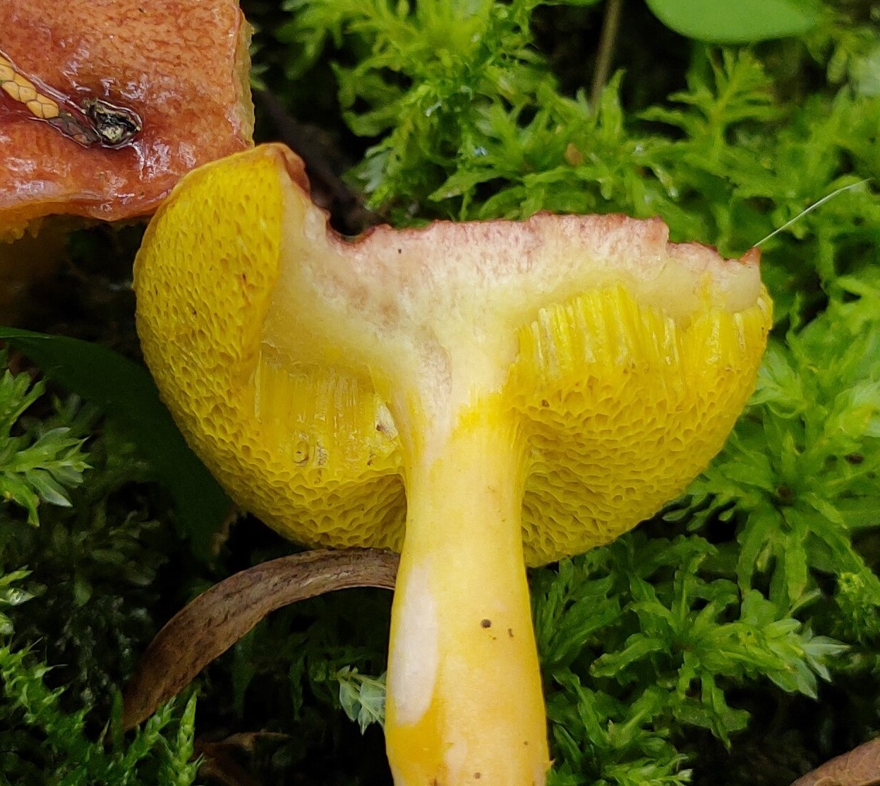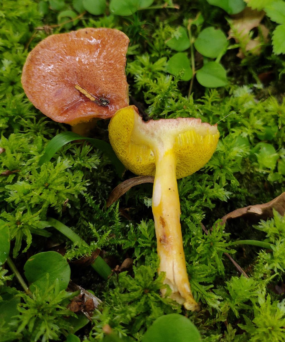 4. Ein Röhrling mit kräftig gelben Röhren und Röhrenmündungen. Der Röhrenboden ist auch gelb. Der Hut ist braun und etwas schmirig.