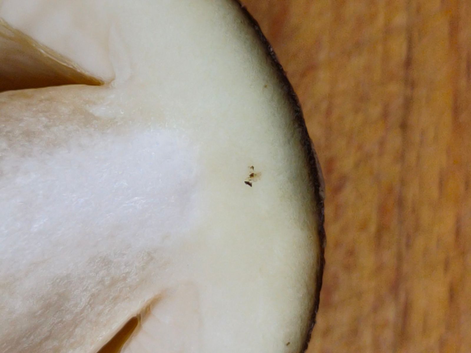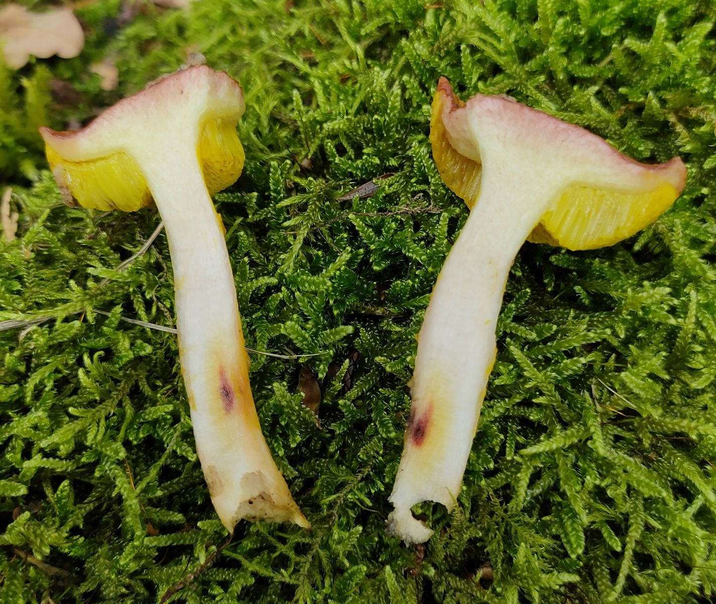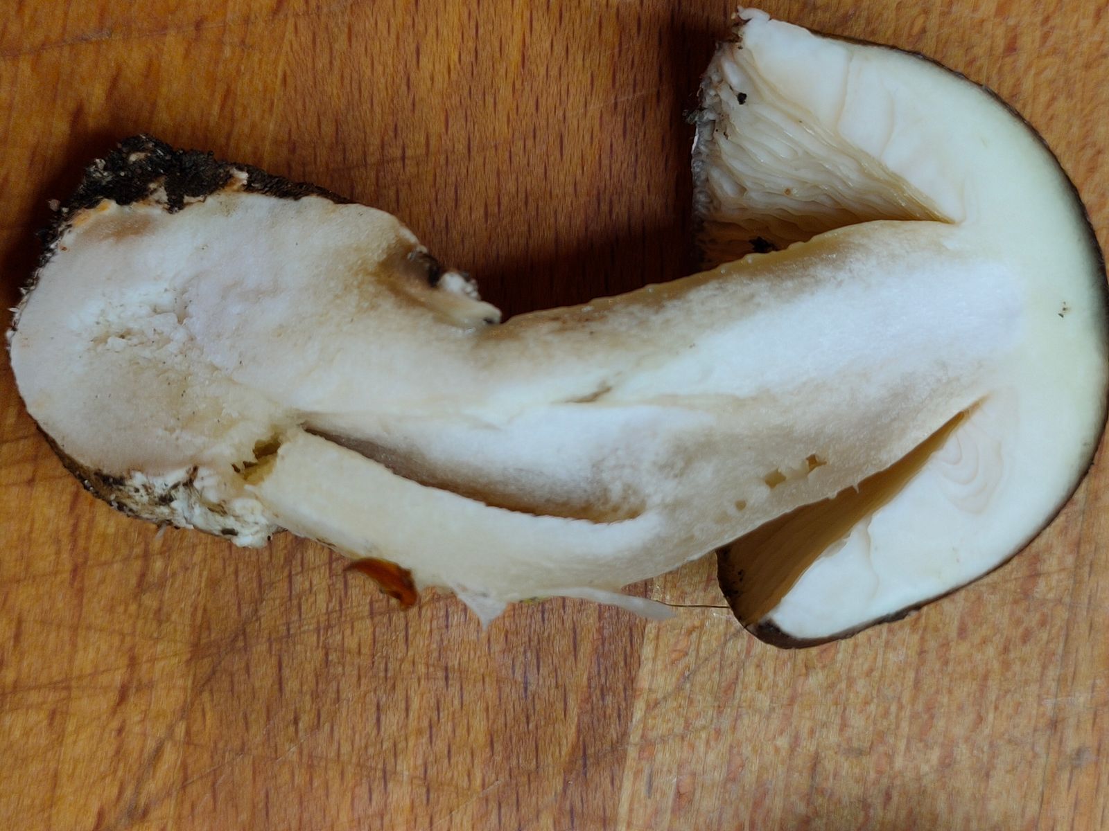 Der Stiel ist ebenfalls gelblich und scheint bei Verletzung braune flecken zu bilden. Das Schnittbild zeigt unter der Huthaut
