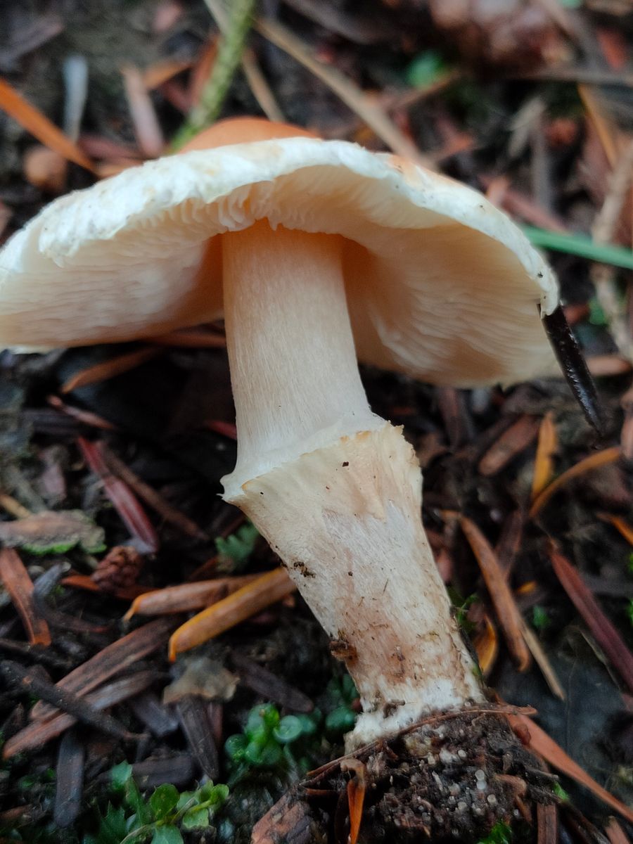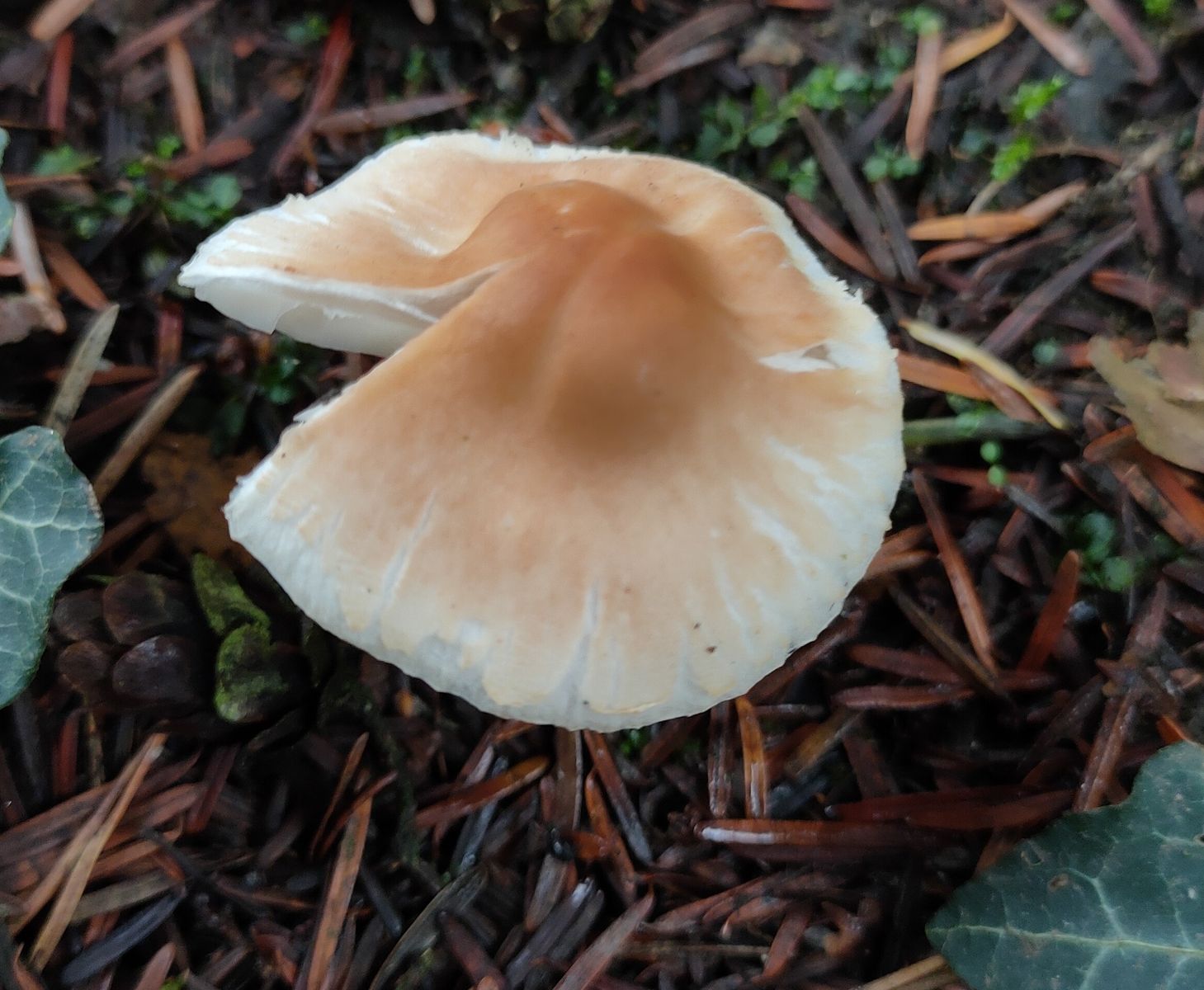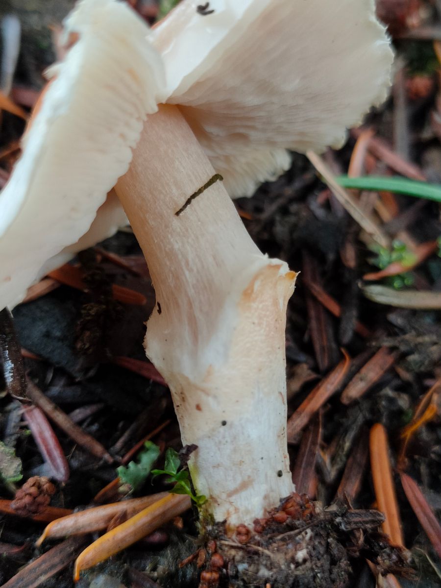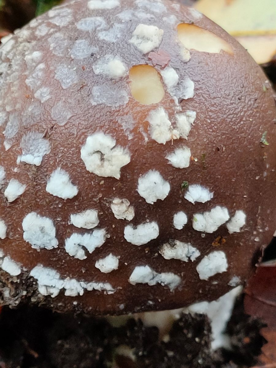 1. Leucoagaricus. Ökologie Nadelbaum (Fichte) lehmiger Untergrund. Der rotbraune feinschuppige Struktur auf weissem Grund der zum Hutrand hin aufreißt.
