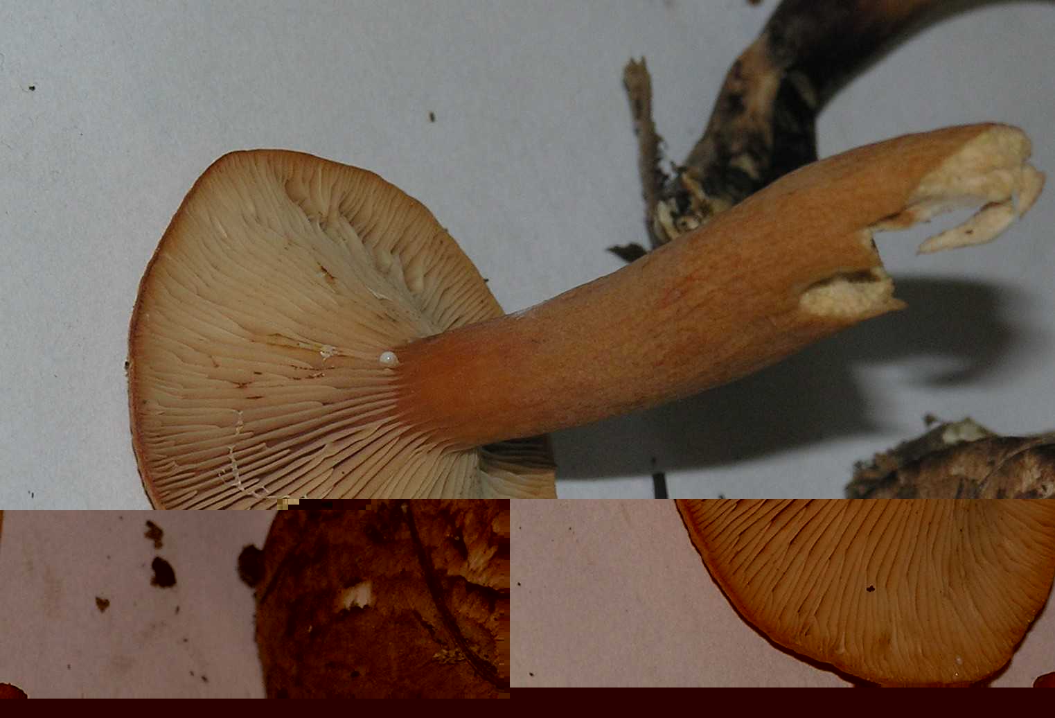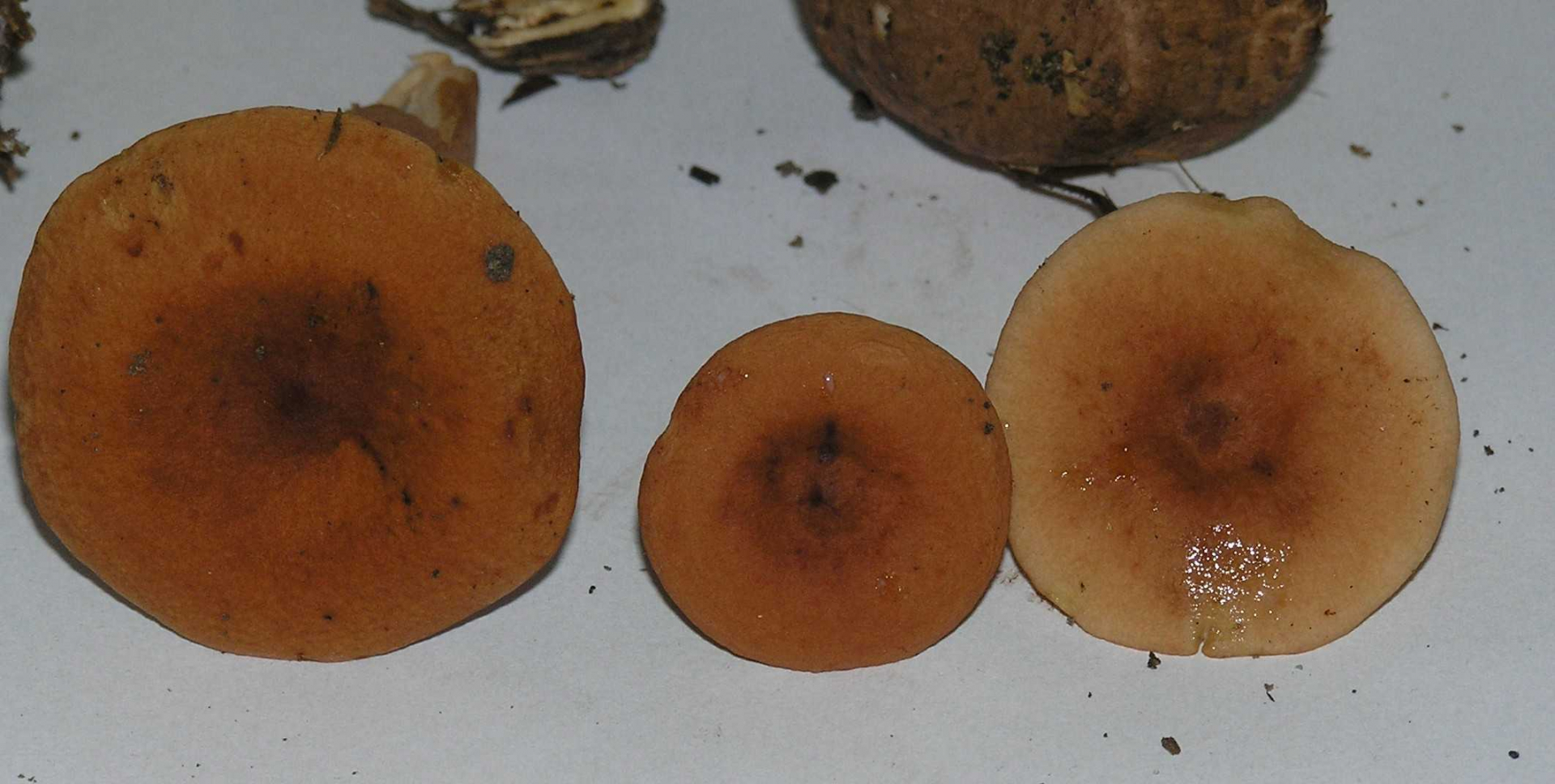 Nr 5 (Bilder 11-12): Lactarius sp. Mit dem Schlüssel aus dem Pareys kam ich zur Sektion Tabidi. Die Beschreibungen passen aber nicht so recht. Die Milch ist zunächst bitter, dann brennend scharf. Die Milch ist zunächst weiß, verfärbt aber auf Küchenpapier schnell ins Gelbe. Als Begleitbäume kämen Birken und Eichen in Betracht.