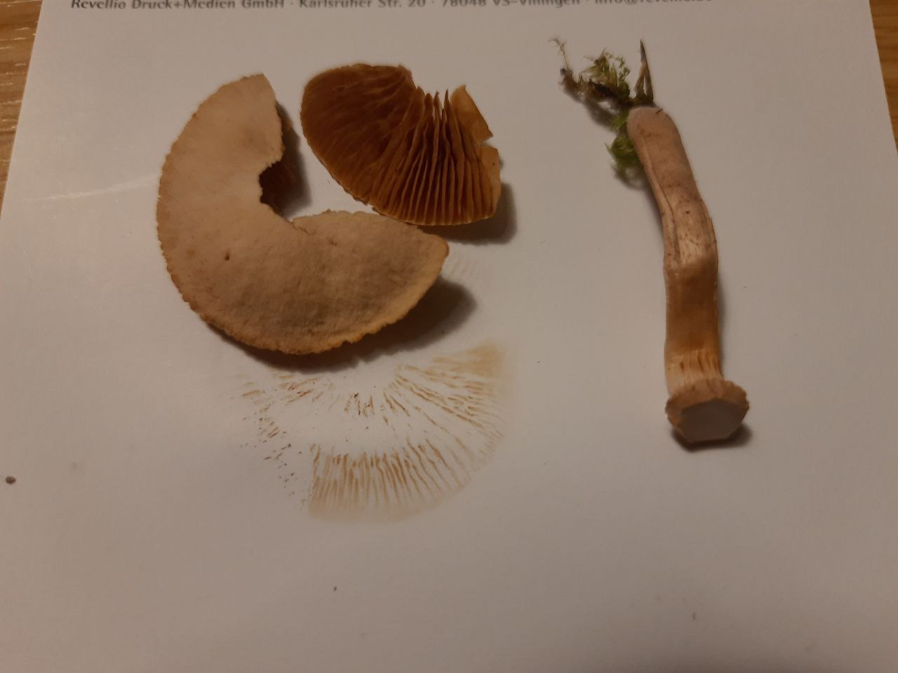 Auf jeden Fall finde ich riecht der Pilz auffallend wie nach Metall, finde ich. Die Lamellen scheinen am Hutrand durch. Das Sporenpulver ist braun, ansonsten sehe ich, dass der Pilz einen Burggraben hat. Der Hut war sehr schwer vom Stiel zu trennen. So ist der Hut trotzdem beim Entfernen des Stiels haften geblieben.