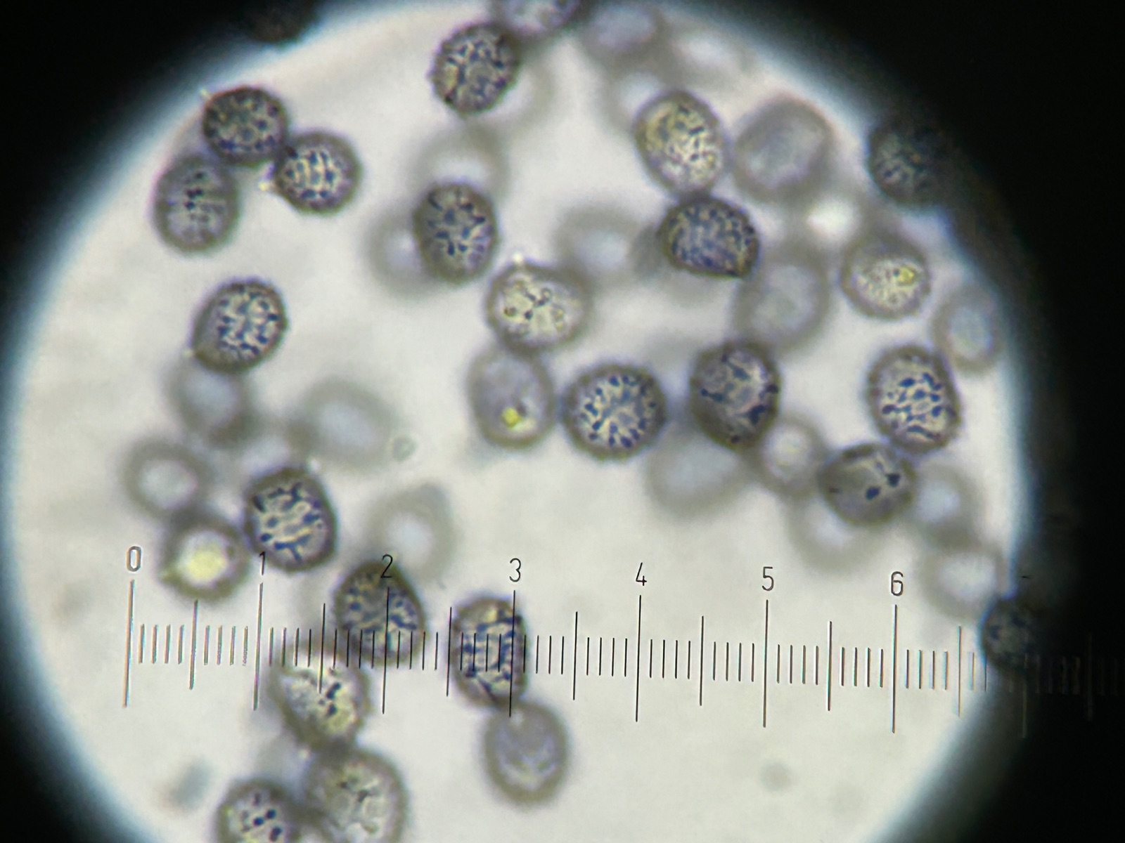 Die Sporen hingegen, waren für mich eher wegweisend (mit dem Handy leider nicht optimal mit meinem gesehenen Bild übermittelbar) die Sporen erachte ich als kaum mittelgross, oder auch länglich oval, erkenne niedrige meist konische Warzen oder Stacheln, durch perschnurartige Formationen sowie feine Verbindungslinien stellenweise zebriert.