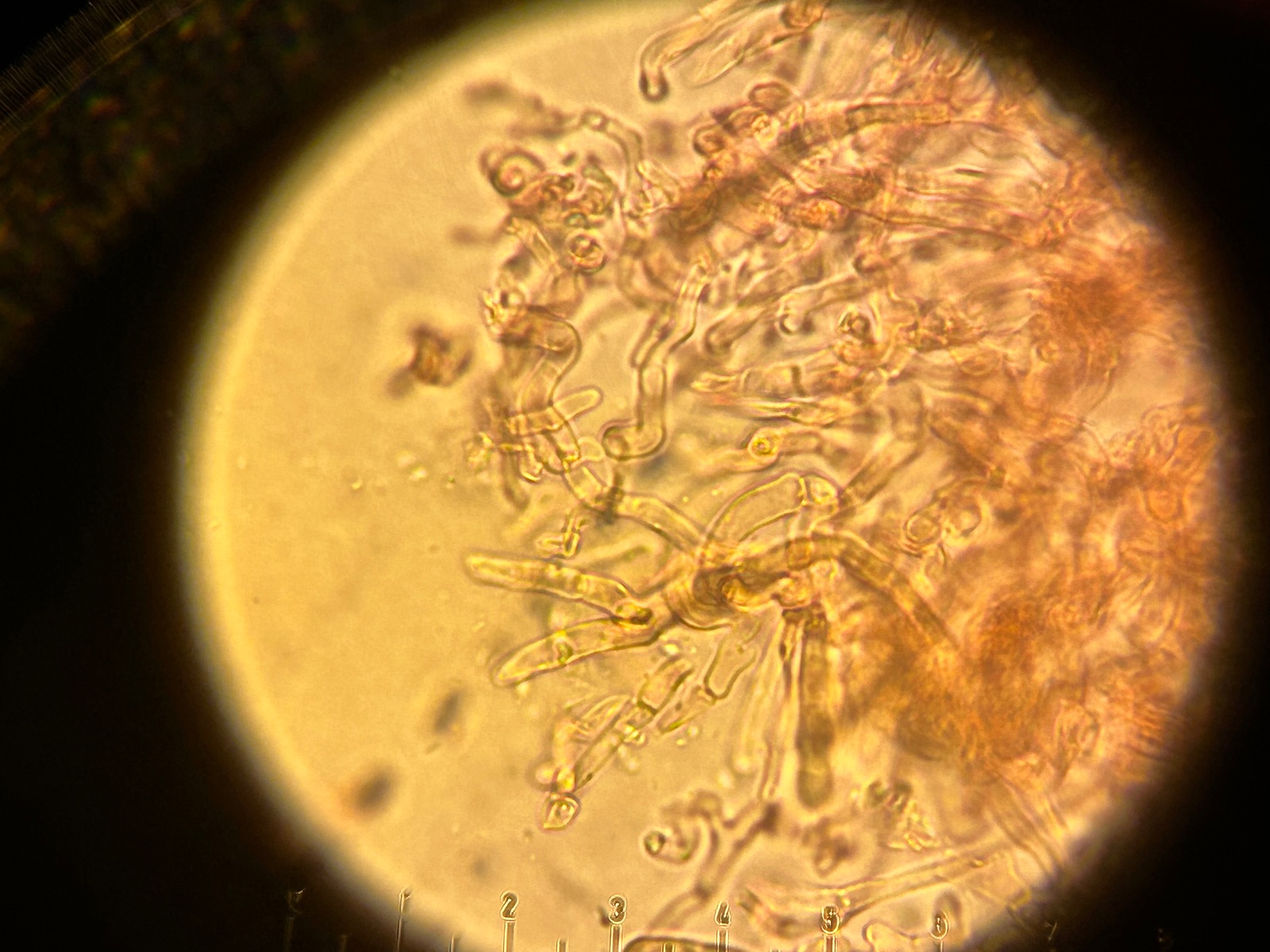 Die HH in Kongo gelang nicht gut, da ich nur der spärlich kleine FK zur Hand hatte. Ich denke, wenigstens septierte Zystidien und breite Epikutishaare zu erkennen.