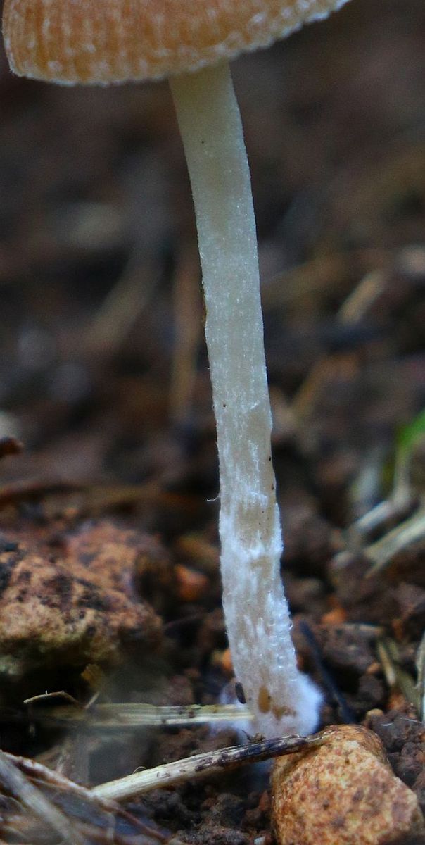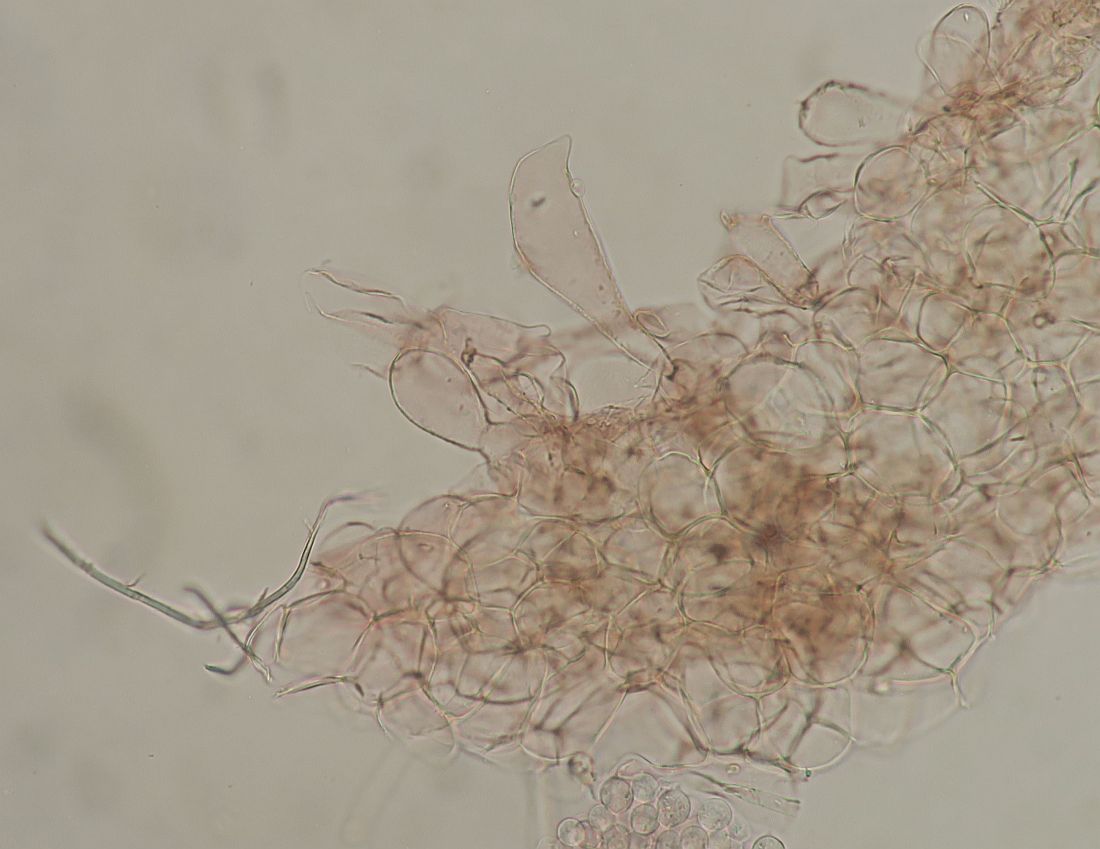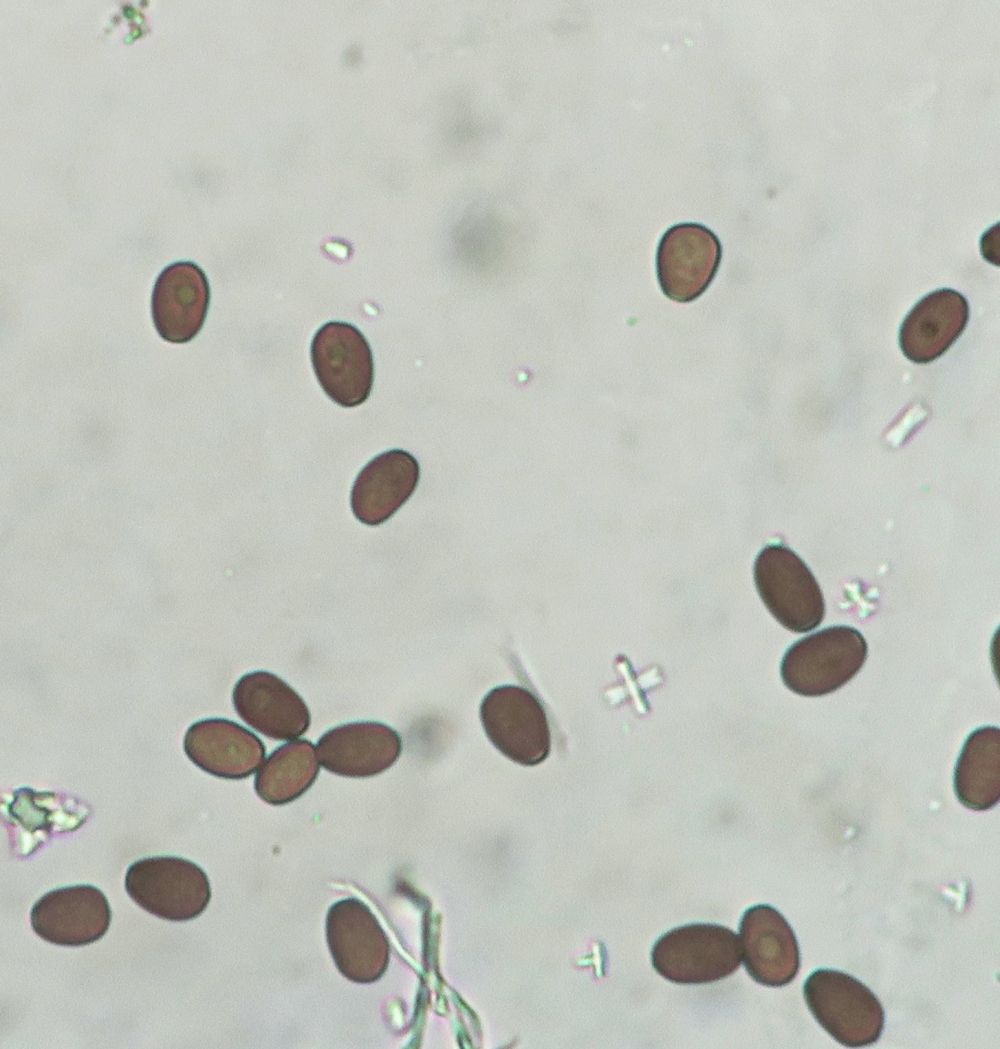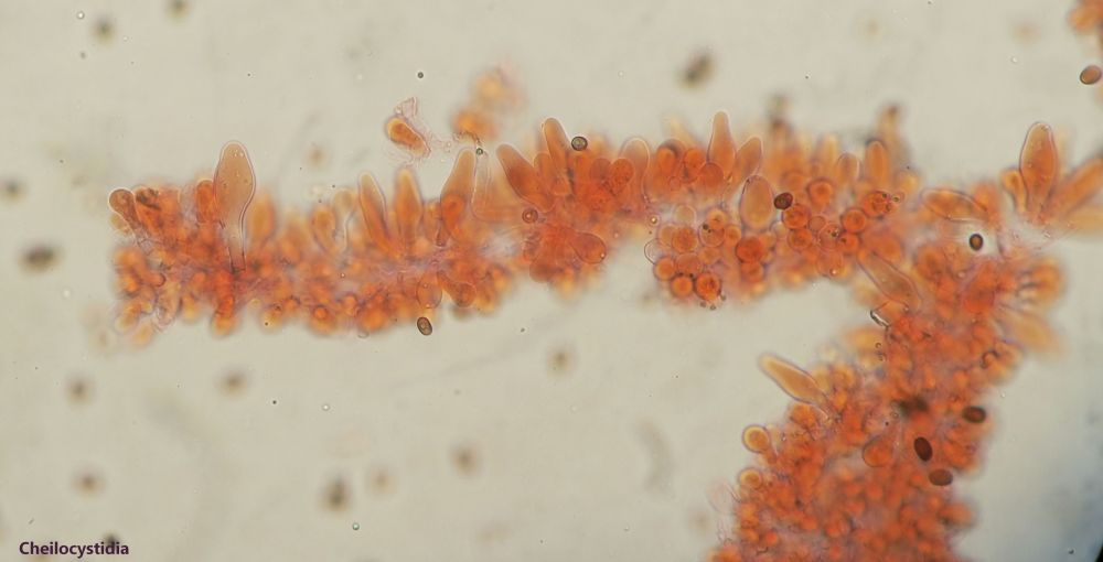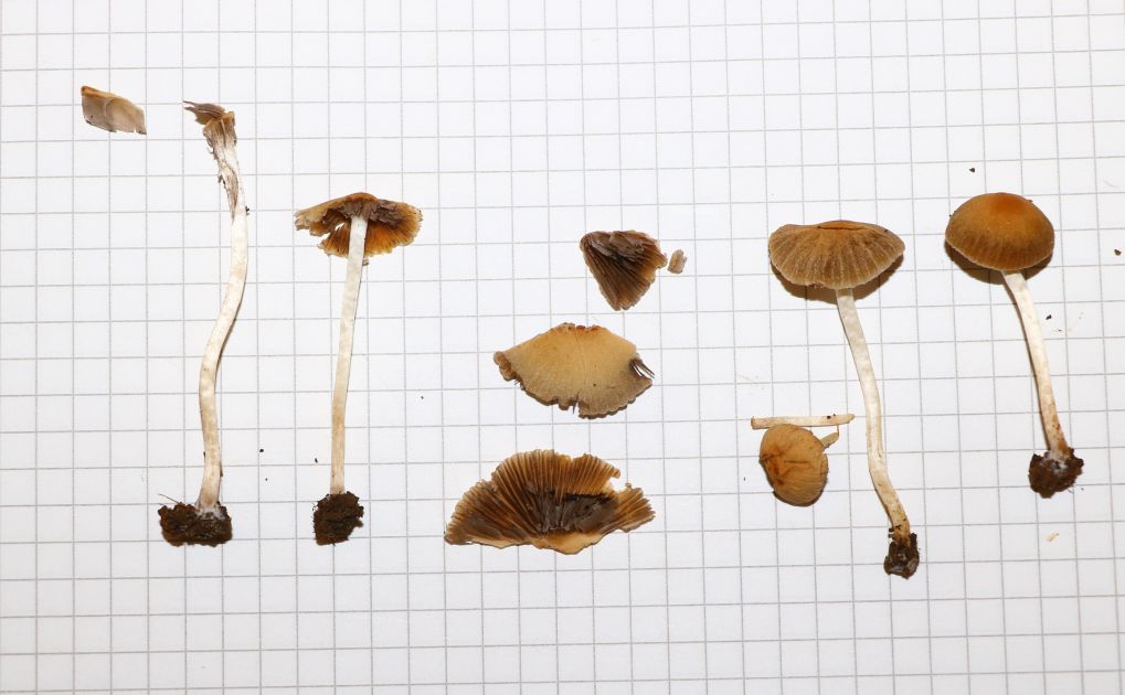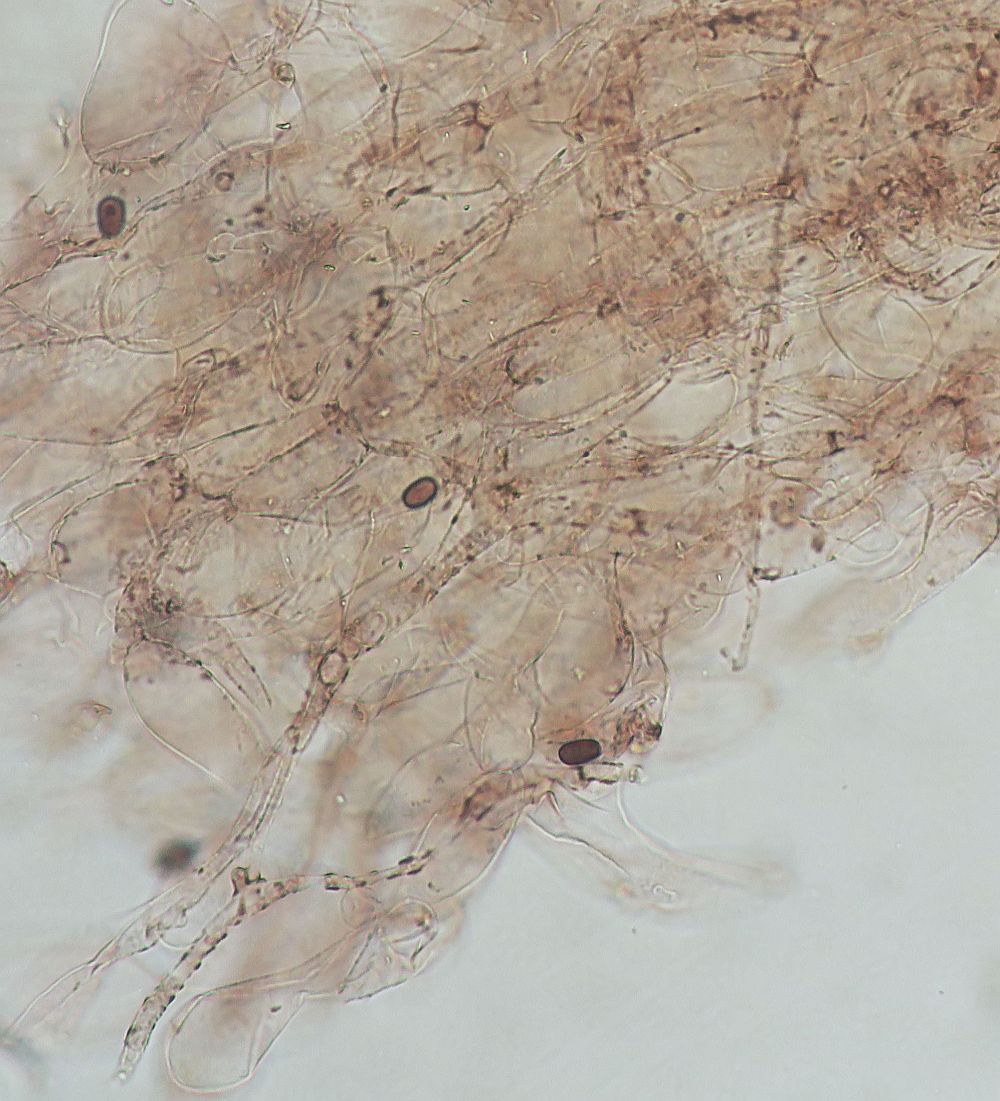 I found this Psathyrella s.l. which is likely a new species for me. It has hazelnut-brown pileus with tiny white fibrils on the pileus (veil remnants) which goes beige-tawn when dry (hence hygrophanous). Because of these fibrils I do not think it is a Parasola. Spores sizes: (6.8) 7.4 - 8.4 (8.6) × (4.5) 5 - 5.7 (5.8) µm // Me = 7.9 × 5.3 µm; They have a wide germ pore. Cheilocystidia abundant, not very large / Pleurocystidia seen, rare or infrequent. The fibrils of the remnant veil seems to have some incrustated pigment. I think I have also seen Pileocystidia (not sure - see last image).