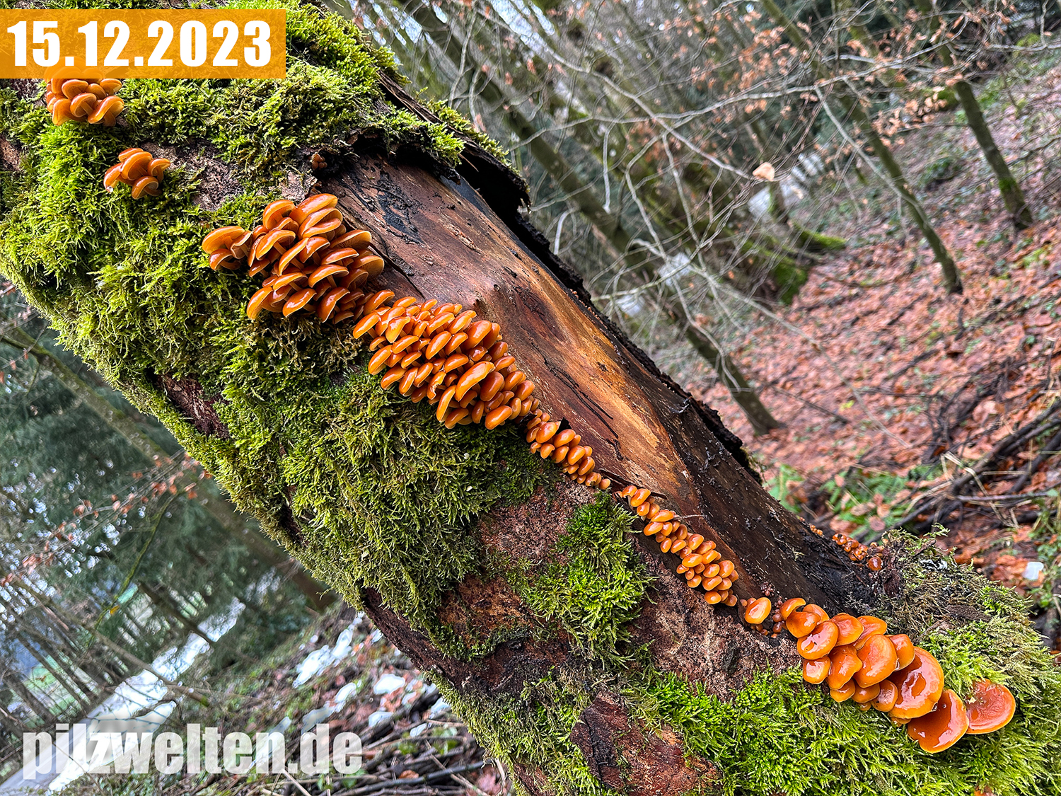 Gefunden haben wir die Samtfußrüblinge im "Baby-Stadium" am 26.11.2023 - danach folgte bei uns in Oberbayern tiefster Winter und so sind die Samtfußrüblinge vom 01.12.2023 bis 08.12.2023 kaum gewachsen. Dann folgte Tauwetter mit viel Regen und das Wachstum explodierte innerhalb weniger Tage.