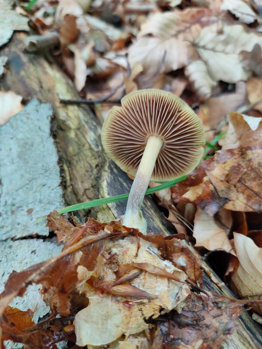 Der Braue Hut ist leicht bereift und die Randzone ausgesprochen gelblich wie die am Stiel ausgebuchtet angewachsnen Schneiden.