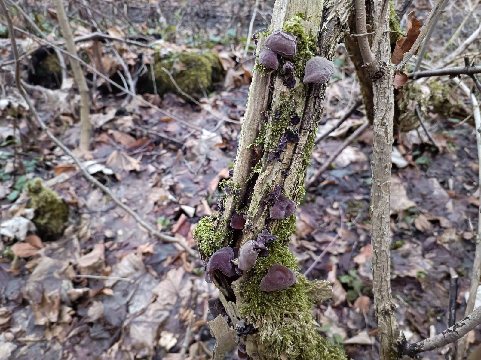 Gleich danach eine Stelle, wo um diese Jahreszeit sicher Auricularia auricula-judae, das Judasohr, zu finden ist.