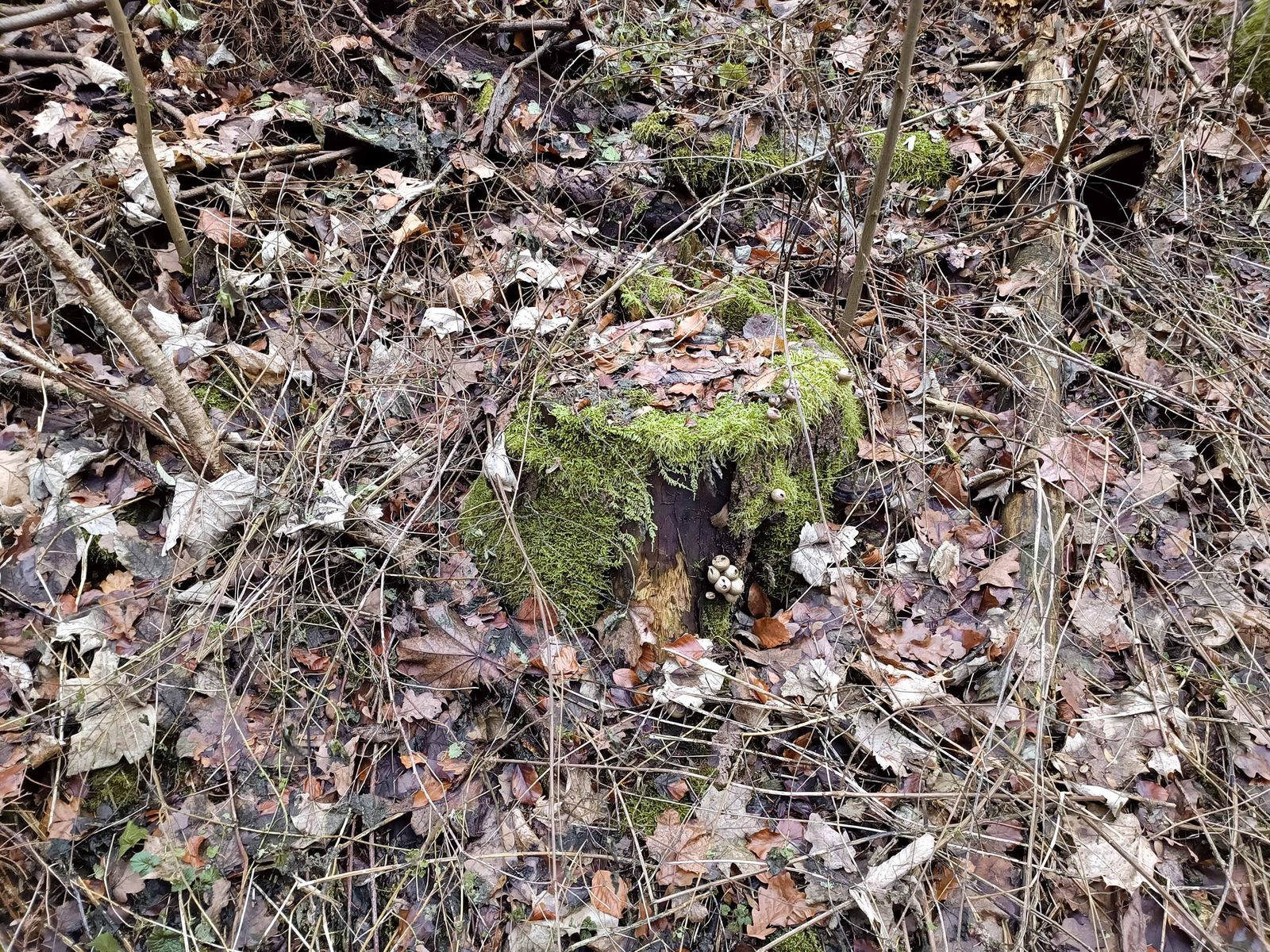 Apioperdon pyriforme, den Birnen-Stäubling, findet man in diesem Gebiet sehr häufig.