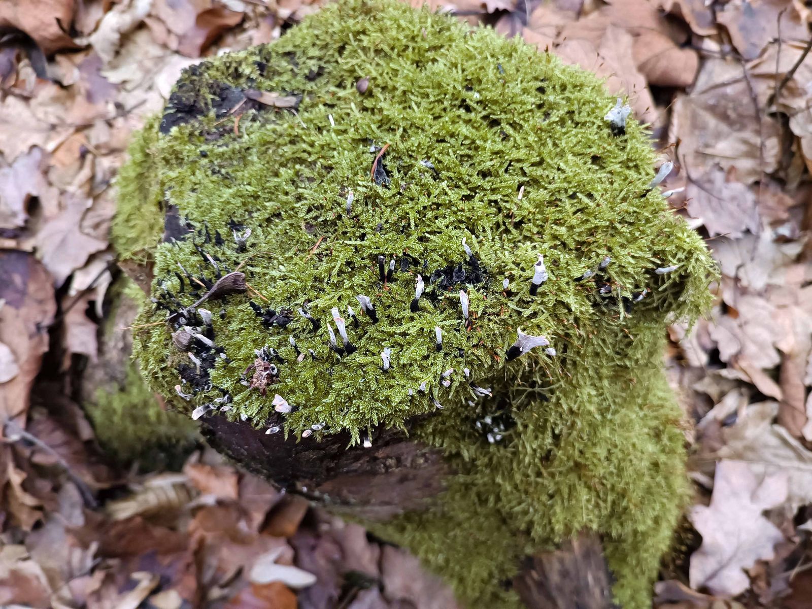Xylaria hypoxylon, die geweihförmige Holzkeule ist dort seltener anzutreffen.