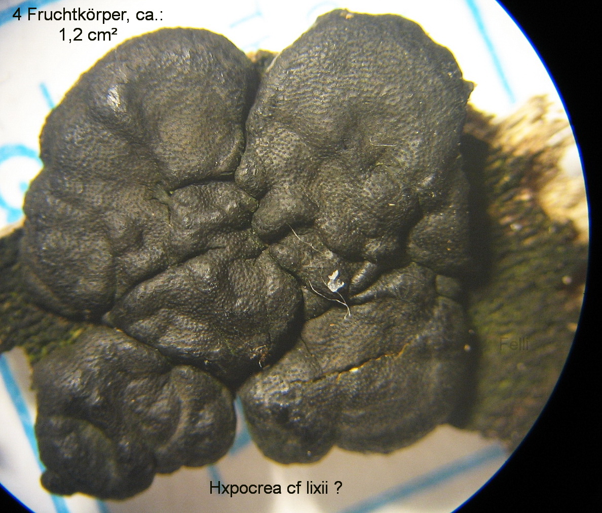 Fruchtkörper 1,5-7 mm! schwärzlich, aneinander gereiht und bis zu 1.5 cm große Fladen bildend.