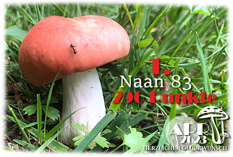 herzlichen Glückwunsch zu Deiner Riesenleistung. Punktzahlen, von denen Normalsterbliche nur träumen können. Schon alleine Deine Beiträge, die sich durch schönen Humor auszeichnen und dabei super sympathisch sind, rechtfertigen Deine Platzierung. Dein offensichtlicher Spürsinn und Deine Pilzkenntnisse sind dann natürlich das, was Deinen Erfolg ausmacht. Es hat sehr, sehr viel Spaß mit Dir gemacht, schön dass Du so präsent warst. Feier noch schön mit Fani (vielleicht mit leckerem Fischlikör?).