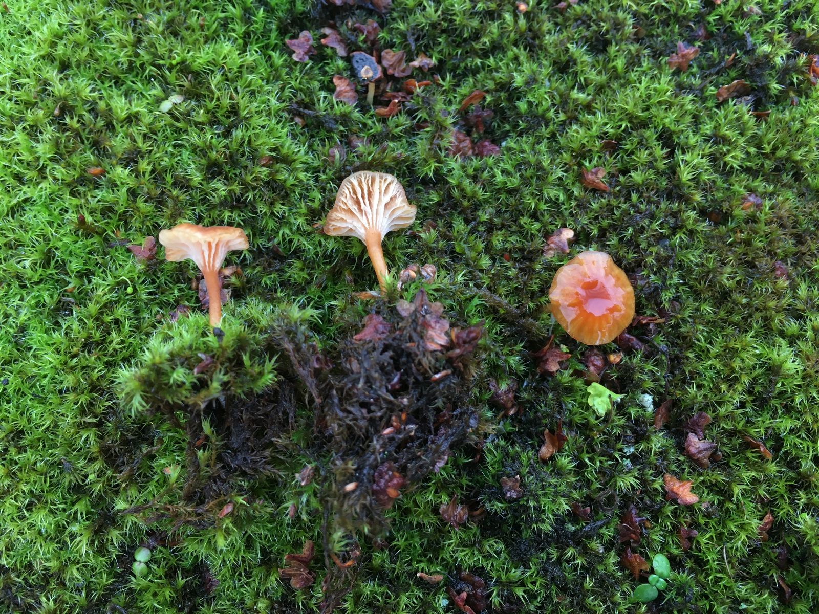Hier bin ich ein paar Tage später nochmal hin- ich habe mich noch nie näher mit Rickenellas beschäftigt, aber es kam mir eigenartig vor, dass die kleinhütigen (vielleicht bis 3mm) die ich aus dem Frauenhaarmoos im Wald kenne die Gleichen sein sollen wie diese großen (mit locker 10-15mm) aus dem Offenland, die fast schon an Hygrocybe cantharellus erinnern.