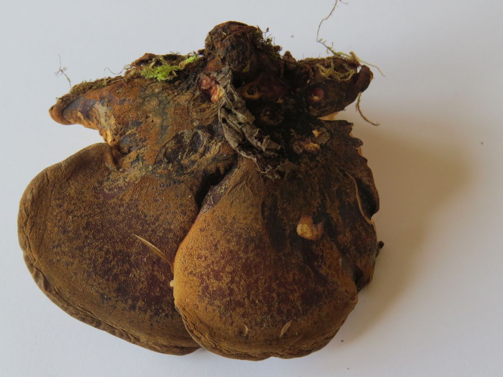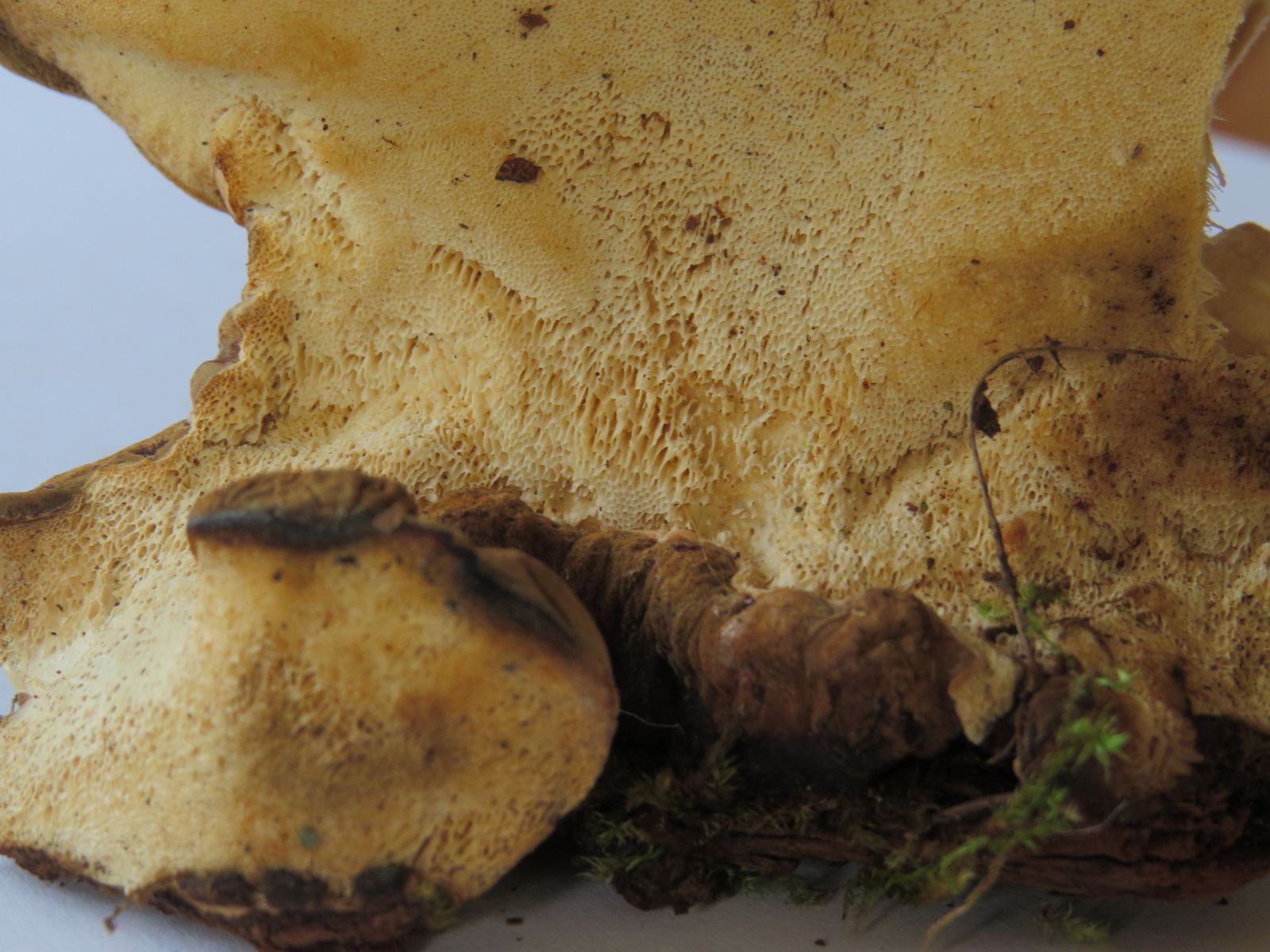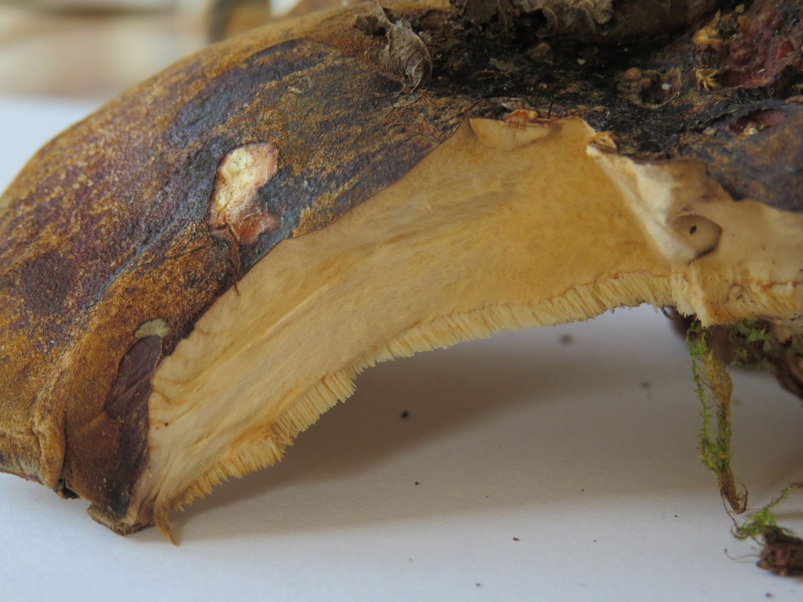 Könnt ihr mir da auf die Sprünge helfen? Inonotus hispidus wäre mein Vorschlag, aber der sollte eher braunes Fleisch haben und auf Druck bräunen? Habe leider noch kein Mikroskop.