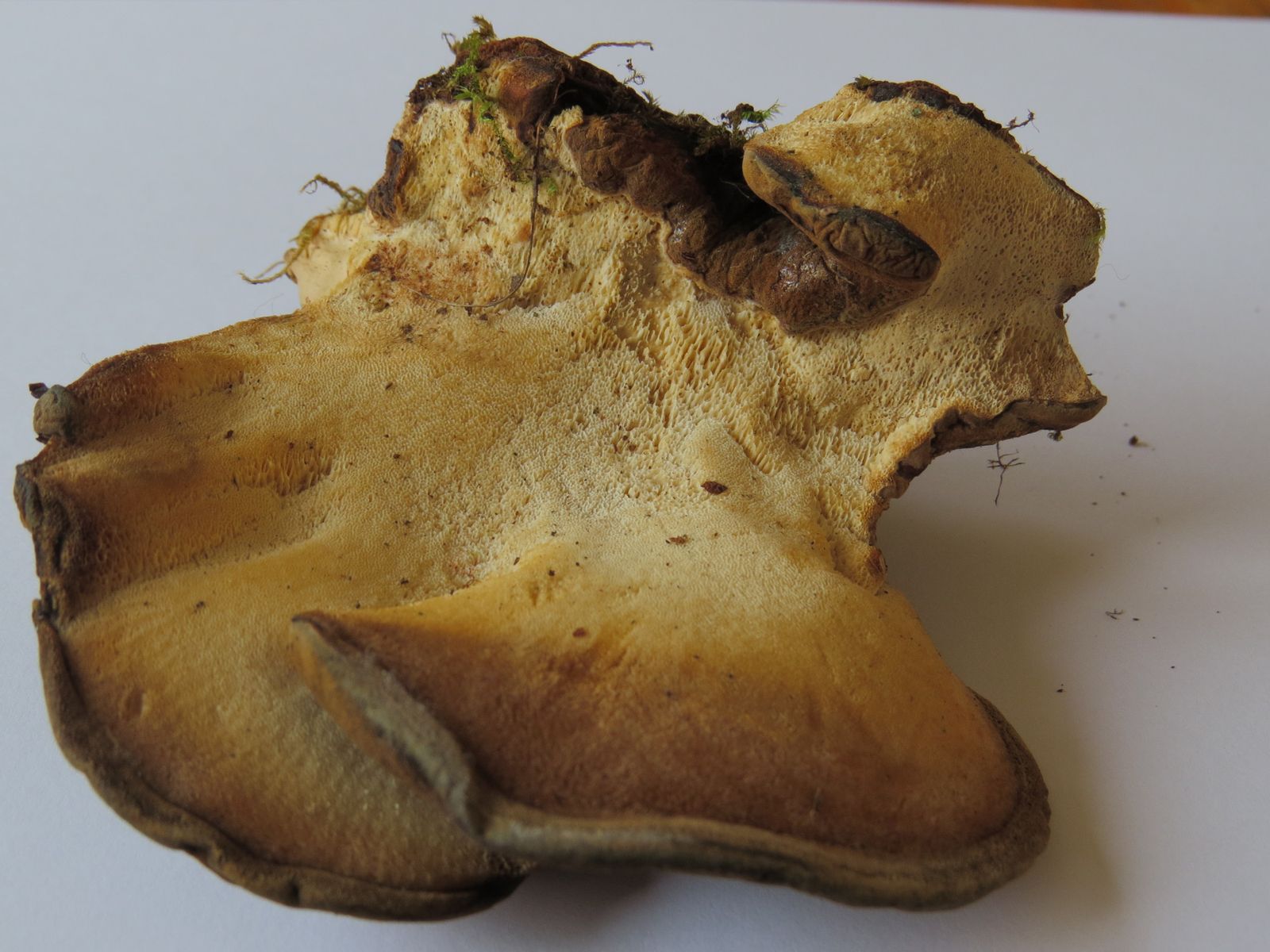 bei einer Auwaldrunde gestern habe ich diesen mir nicht bekannten Porling entdeckt. Da es schon dämmrig war, habe ich den Fruchtkörper mit nach Hause genommen und heute am Küchentisch fotografiert.
