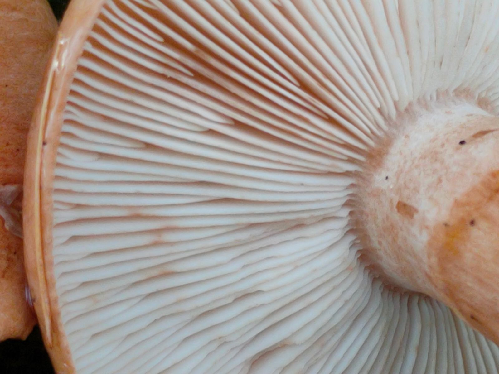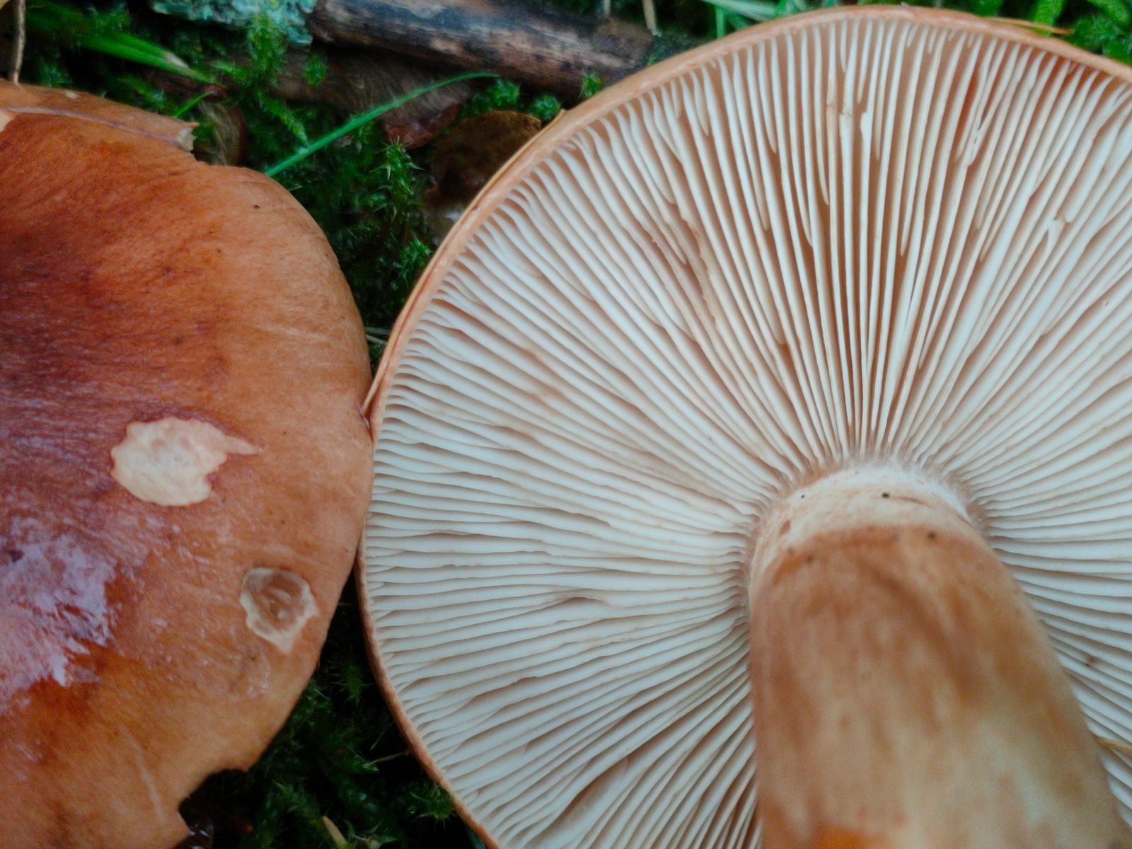Der feucht schmierige mit deutlichen radialen Strukturen des braunen Hutes, die weissen fast ohne Burggraben angewachsen