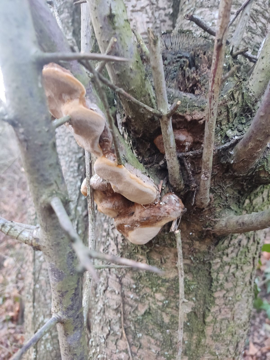Der Baum könnte eine Kirsche und der Pilz dann ein Pflaumenfeuerschwamm Phellinus pomaceus (wächst auch an Kirsche) sein.