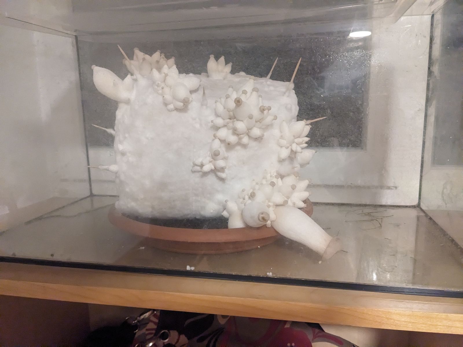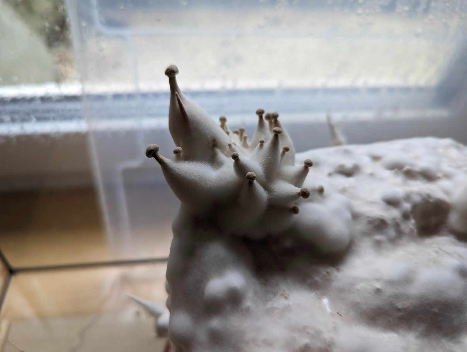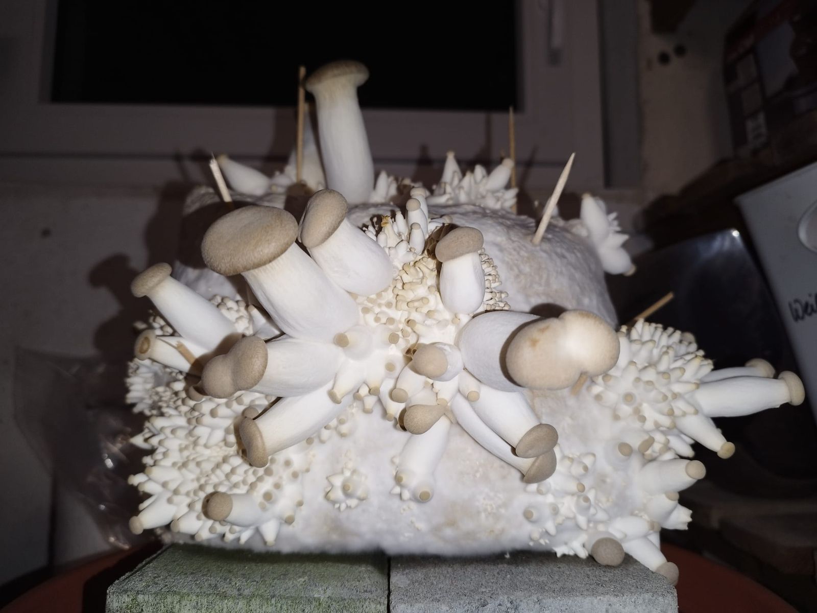 In unserem Keller steht gerade unser erstes Pilzzuchtset, Kräuterseitlinge, die wir zu Weihnachten geschenkt bekommen haben. Bislang entwickeln sie sich prächtig, siehe Foto. Statt der Folienhaube haben wir das Substrat in ein ausgedientes kleines Aquarium gestellt und einen Deckel darüber gelegt.