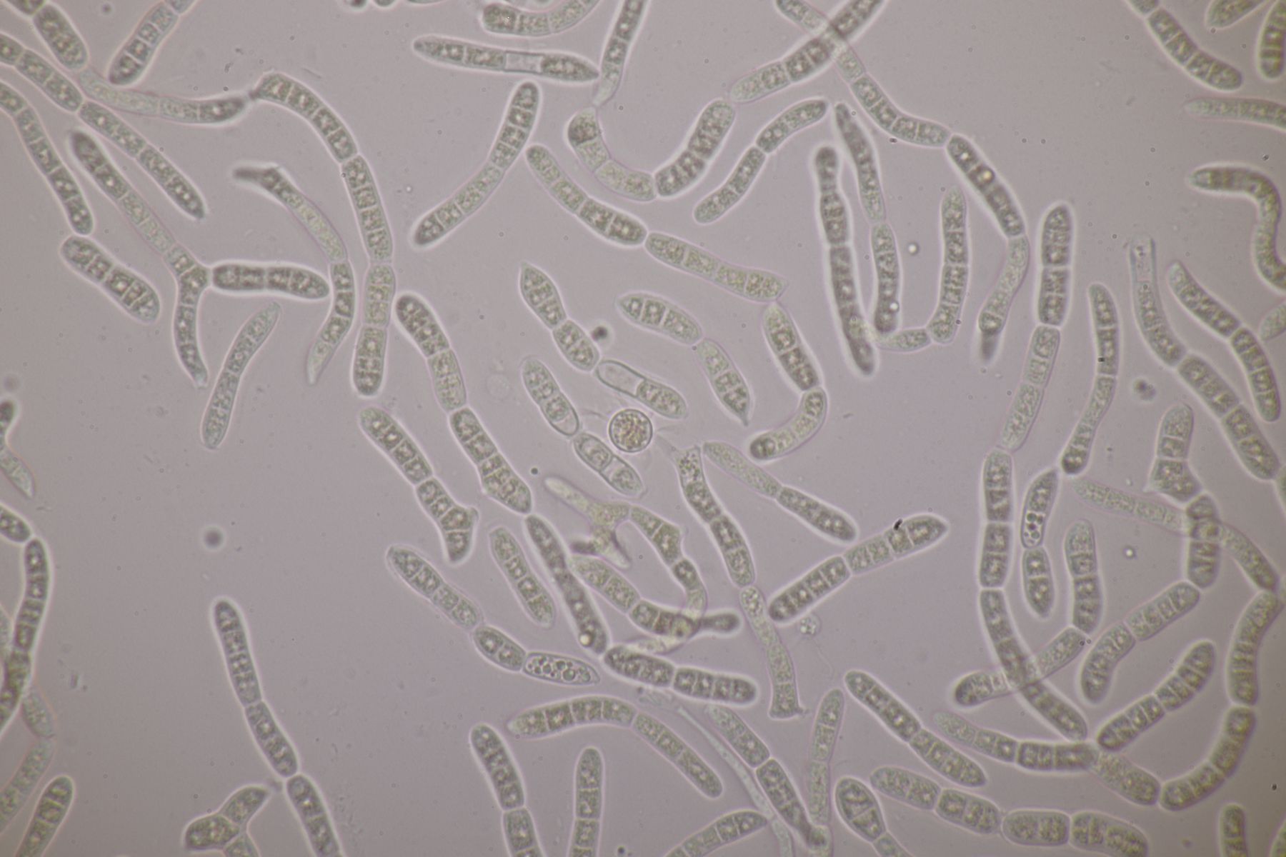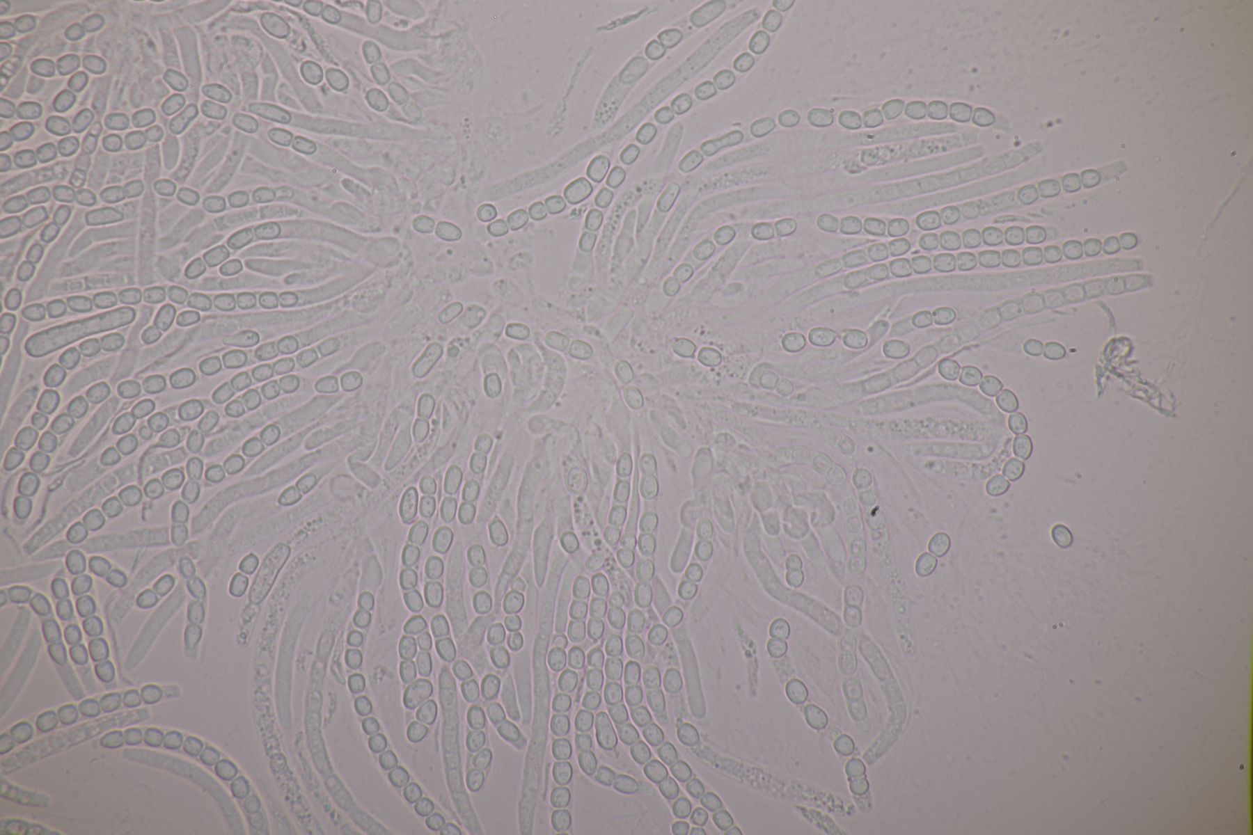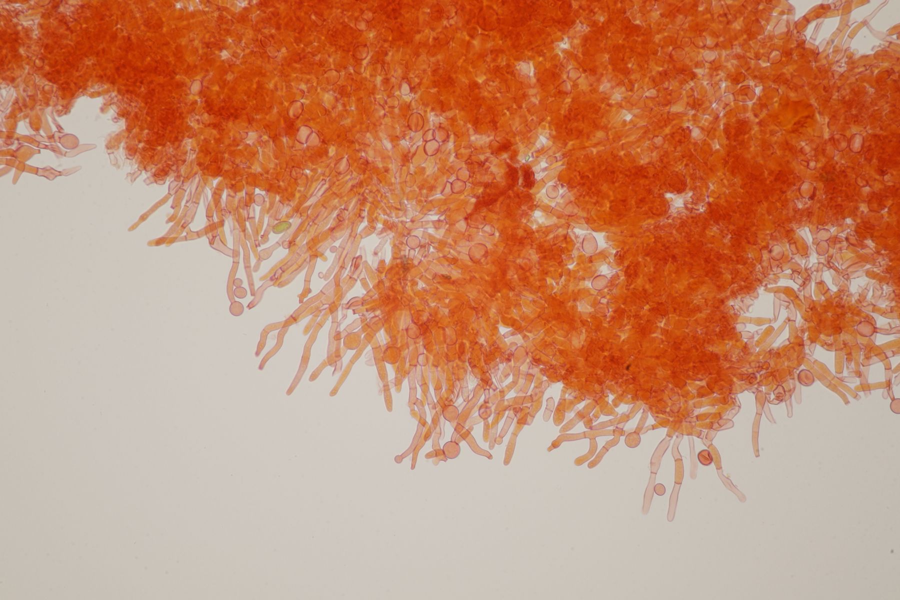 3. Auf der Schnittfläche von einem alten Fomitopsis pinicola Fruchtkörper gab es dann noch einen weißen Belag. In der Hoffnung, daß das ein fungicoler Phragmobasidiomycet ist, hatte ich das Dingen eingepackt, wurde dann aber am Mikro enttäuscht: Eine Anamorphe, zu der mit leider nichts einfällt. Vielleicht hat ja einer von euch eine Idee dazu?