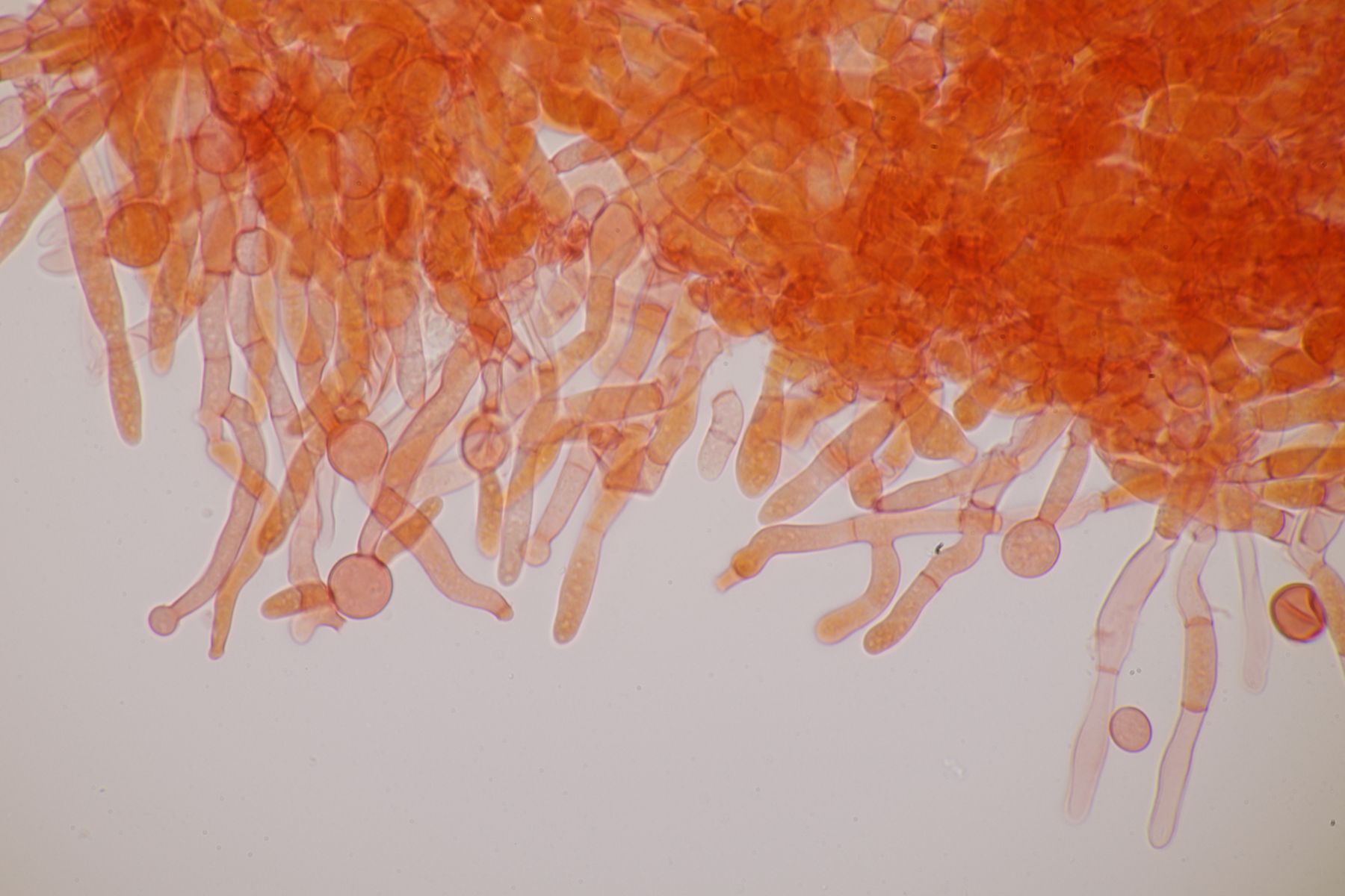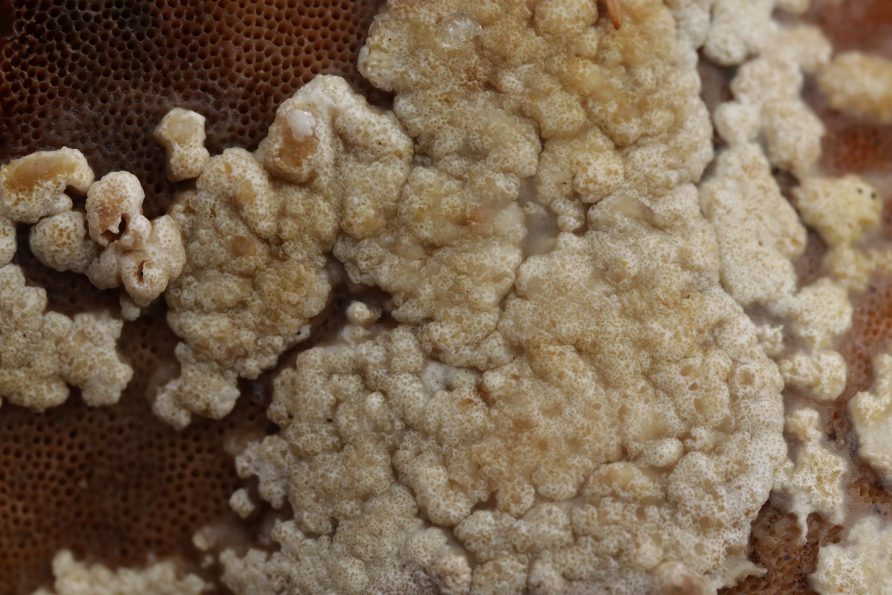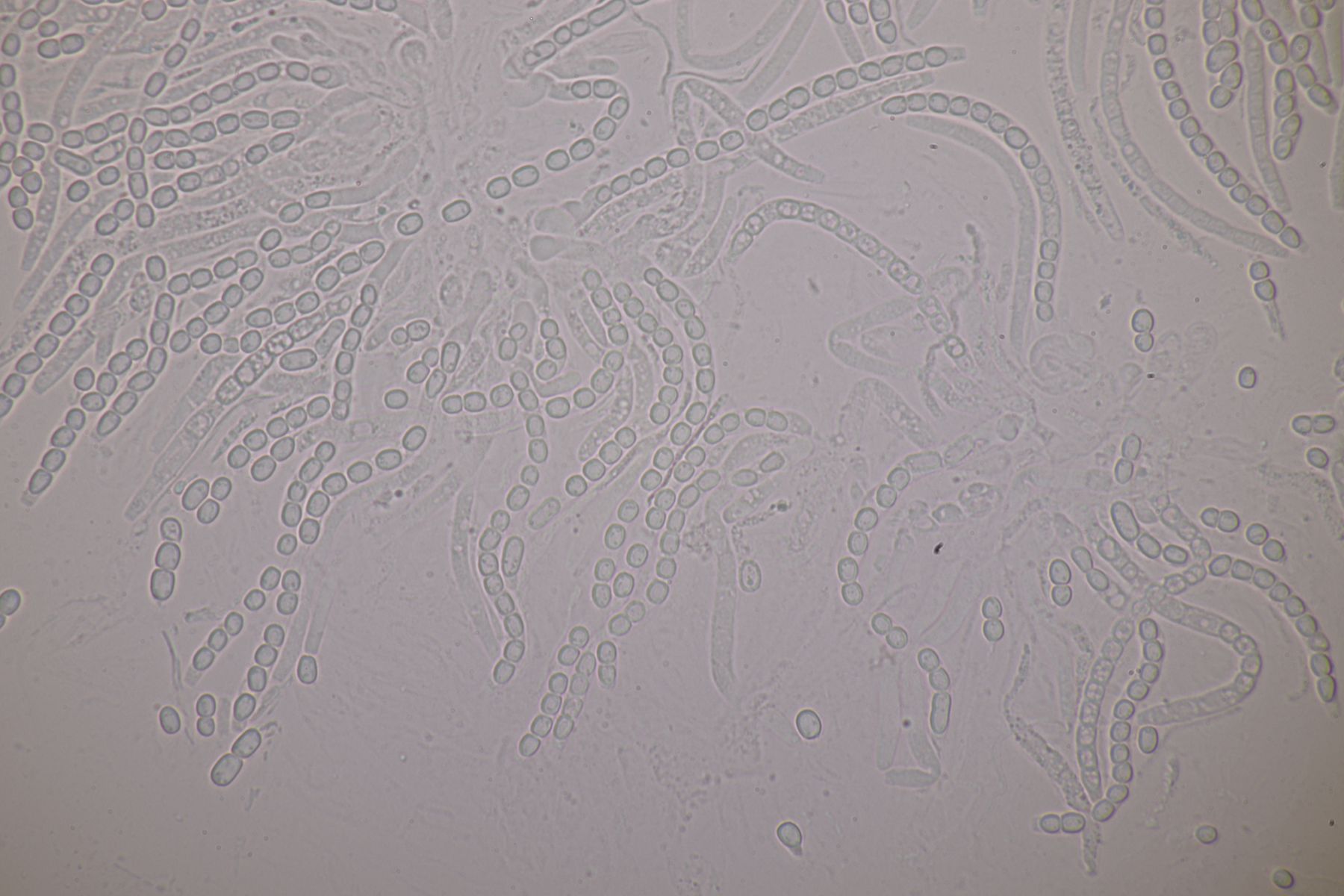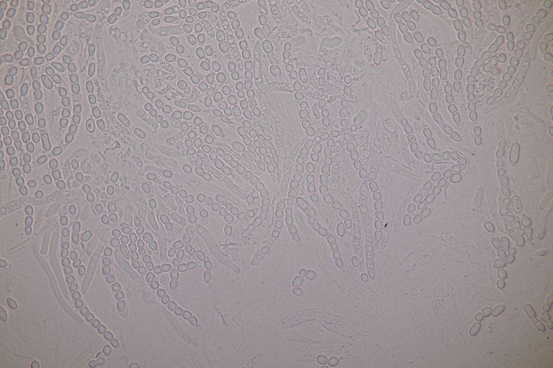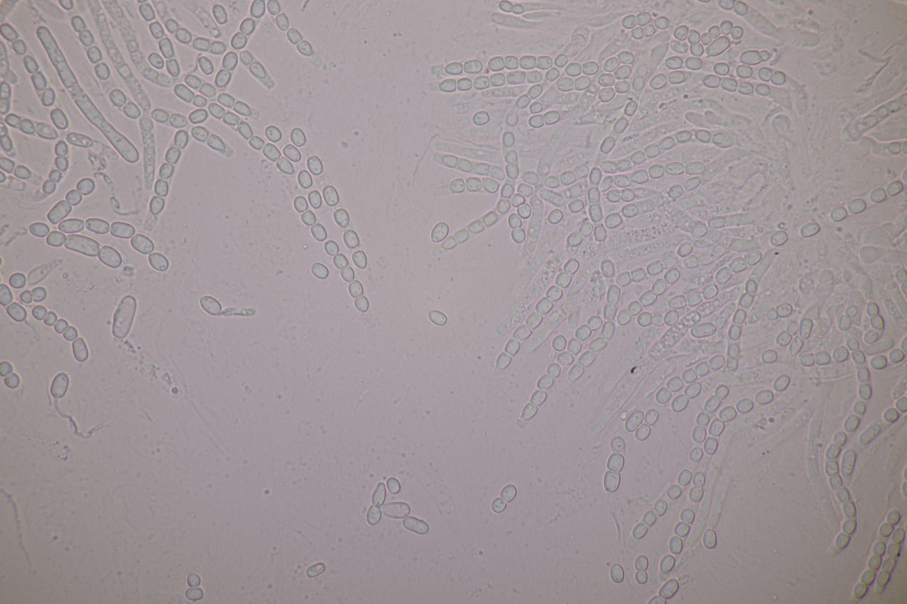 3. Auf der Schnittfläche von einem alten Fomitopsis pinicola Fruchtkörper gab es dann noch einen weißen Belag. In der Hoffnung, daß das ein fungicoler Phragmobasidiomycet ist, hatte ich das Dingen eingepackt, wurde dann aber am Mikro enttäuscht: Eine Anamorphe, zu der mit leider nichts einfällt. Vielleicht hat ja einer von euch eine Idee dazu?